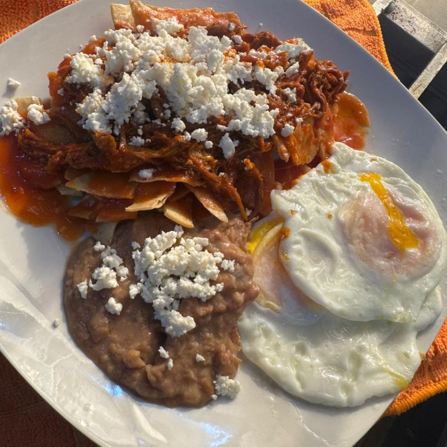 CHILAQUILES ROJOS CON DESHEBRADA GUISADA Y QUESO, ACOMPAÑADOS DE FRIJOLES CON QUESO Y DOS HUEVOS ESTRELLADOS Y ENSALADA ADEMAS DE 4 TORTILLAS DE MAIZ.