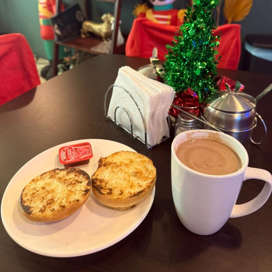UNA CAFE AMERICANO CON LECHE ENTERA + BISQUETE EN DOS PARTES CON MANTEQUILLA A LA PLANCHA Y MERMELADA DE FRESA.
