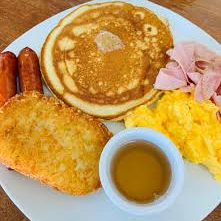 2 huevo revueltos, 2 tiras de tocino 2 hotcakes 1papa hash Brown