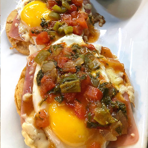 2 Huevos Estrellados sobre Tortillas de Maíz Frijoles y Jamón Bañados en Salsa Tatemada