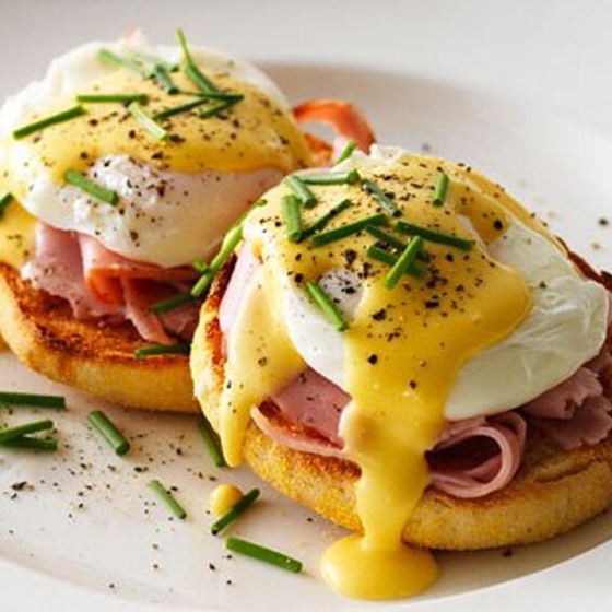 2 Huevos ponchados montados en un bisquet, bañados en salsa holandesa