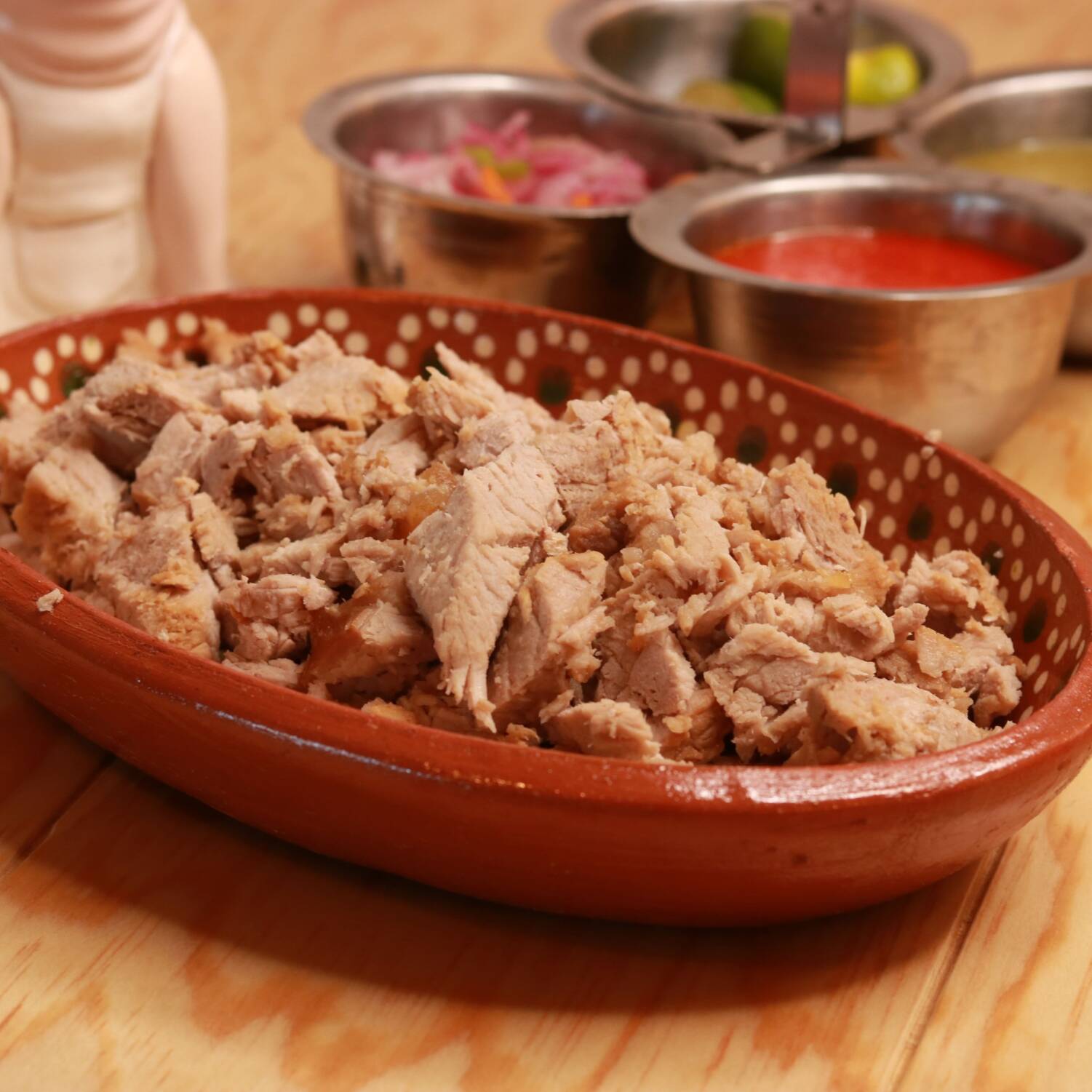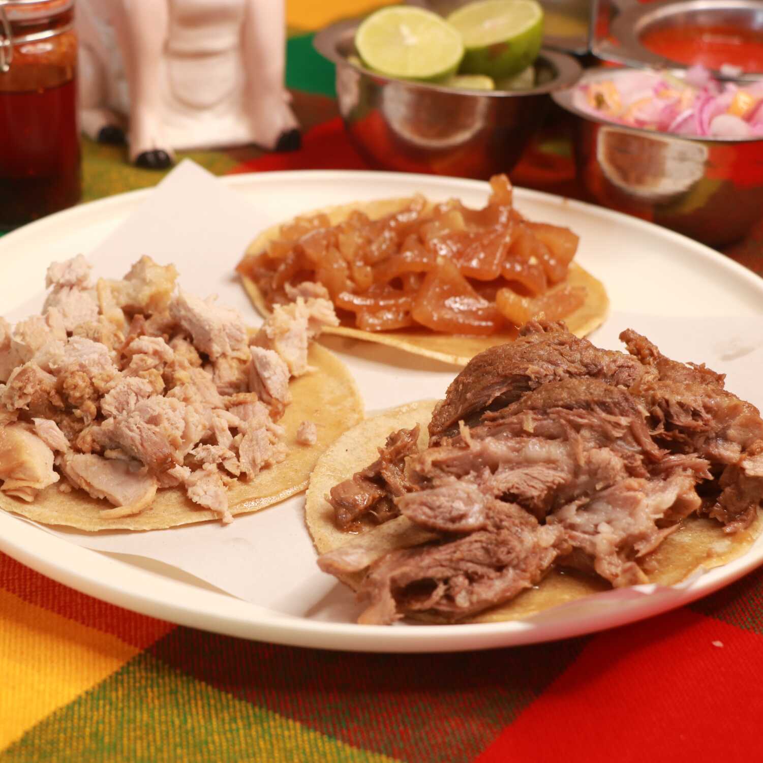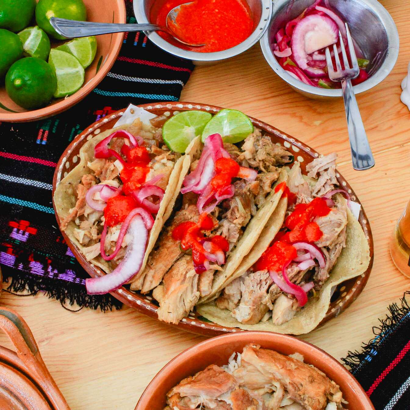 Taco de tortilla de maíz recién hecha de carnitas, incluye salsas, limones y cebolla encurtida