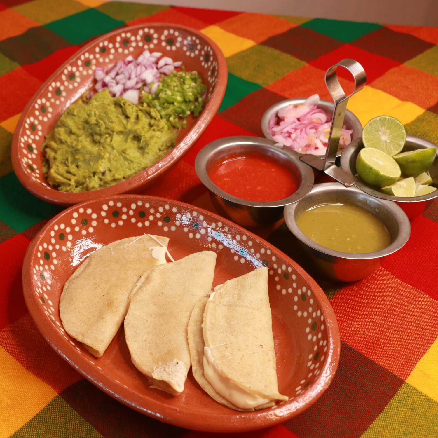 Orden de 3 quesadillas con tortilla de maíz recién hechas, incluye salsas y cebolla encurtida