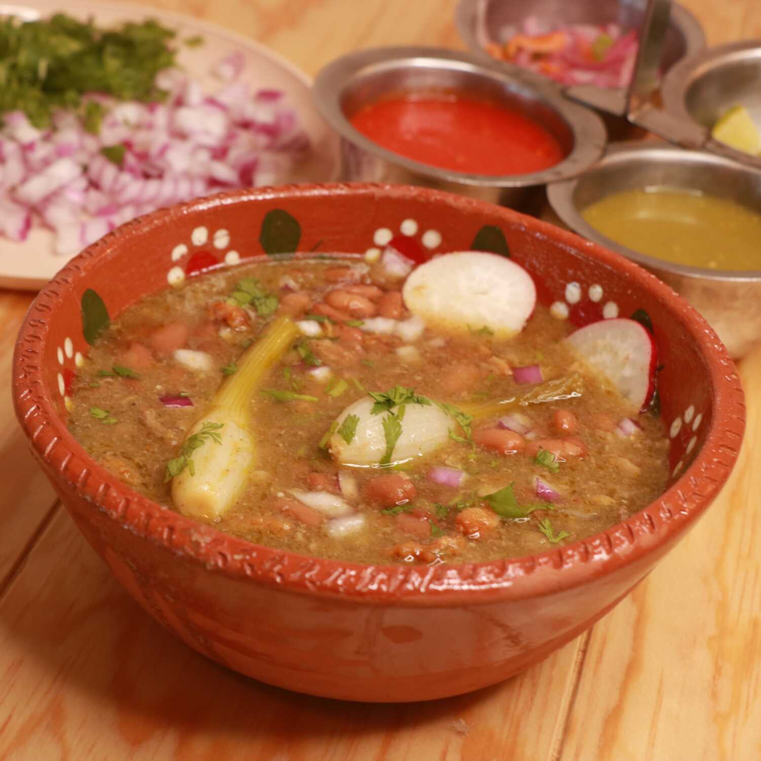 Incluye tortillas, salsas, limones y cebollitas encurtidas.