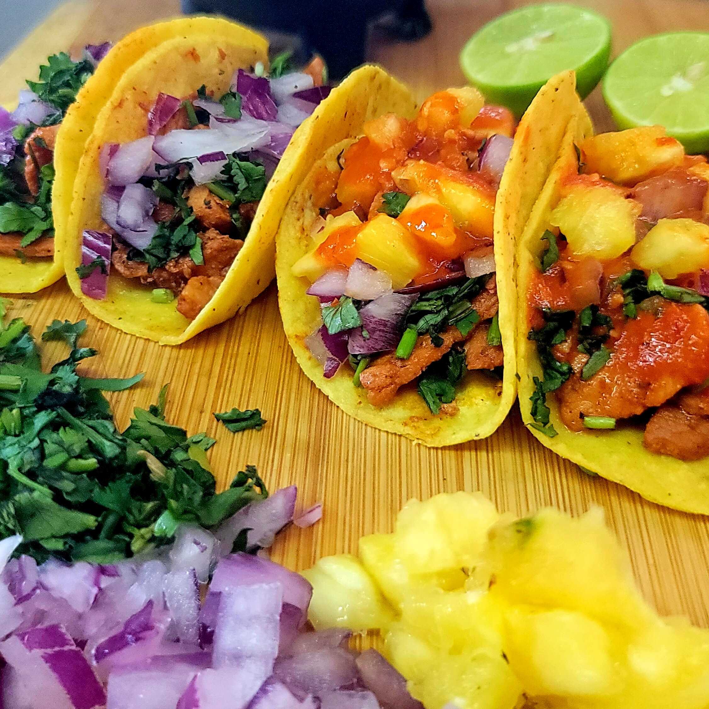 Pastor, bisteck, aguacate, queso fundido, cebolla frita, cilantro, cebolla. Salsas verde y roja