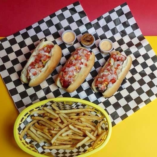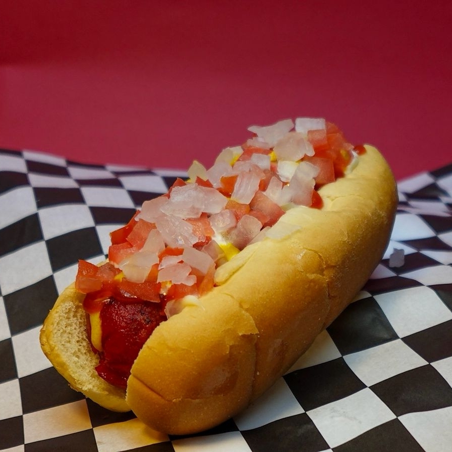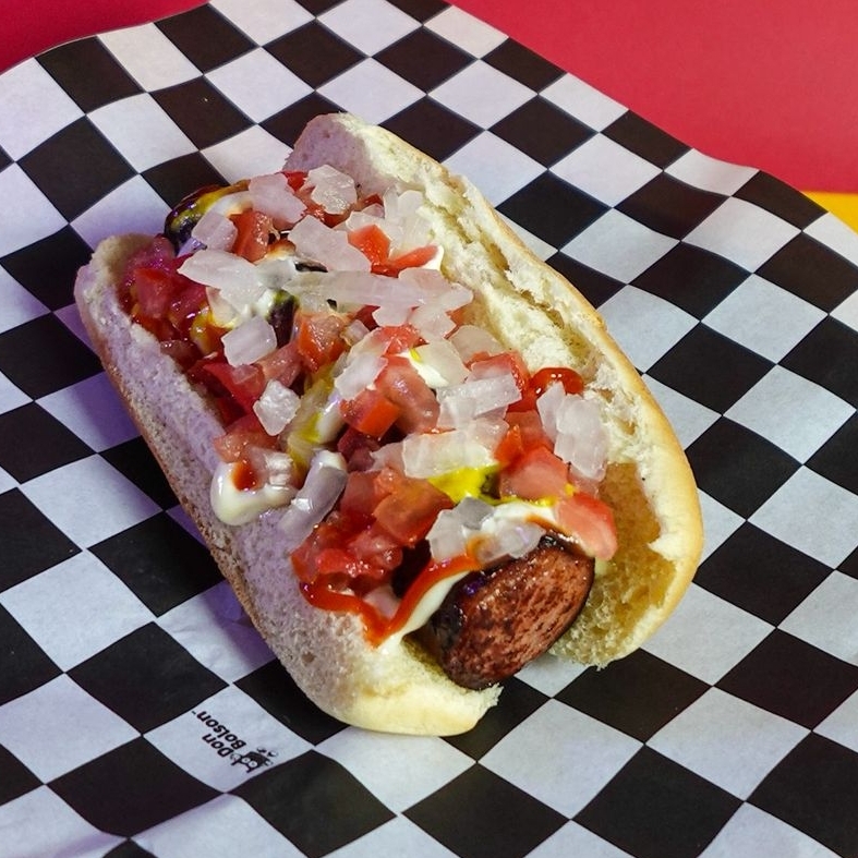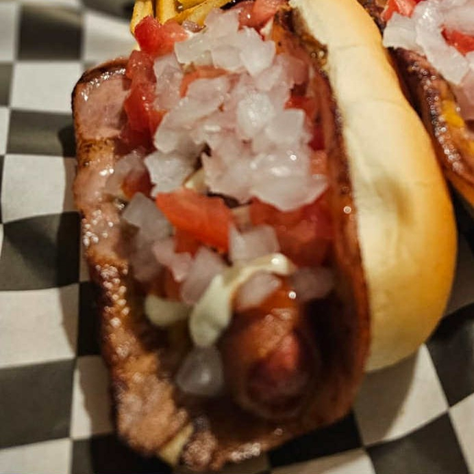 salchicha de pollo, tocino, mayonesa, mostaza, ketchup, tomate, cebolla.