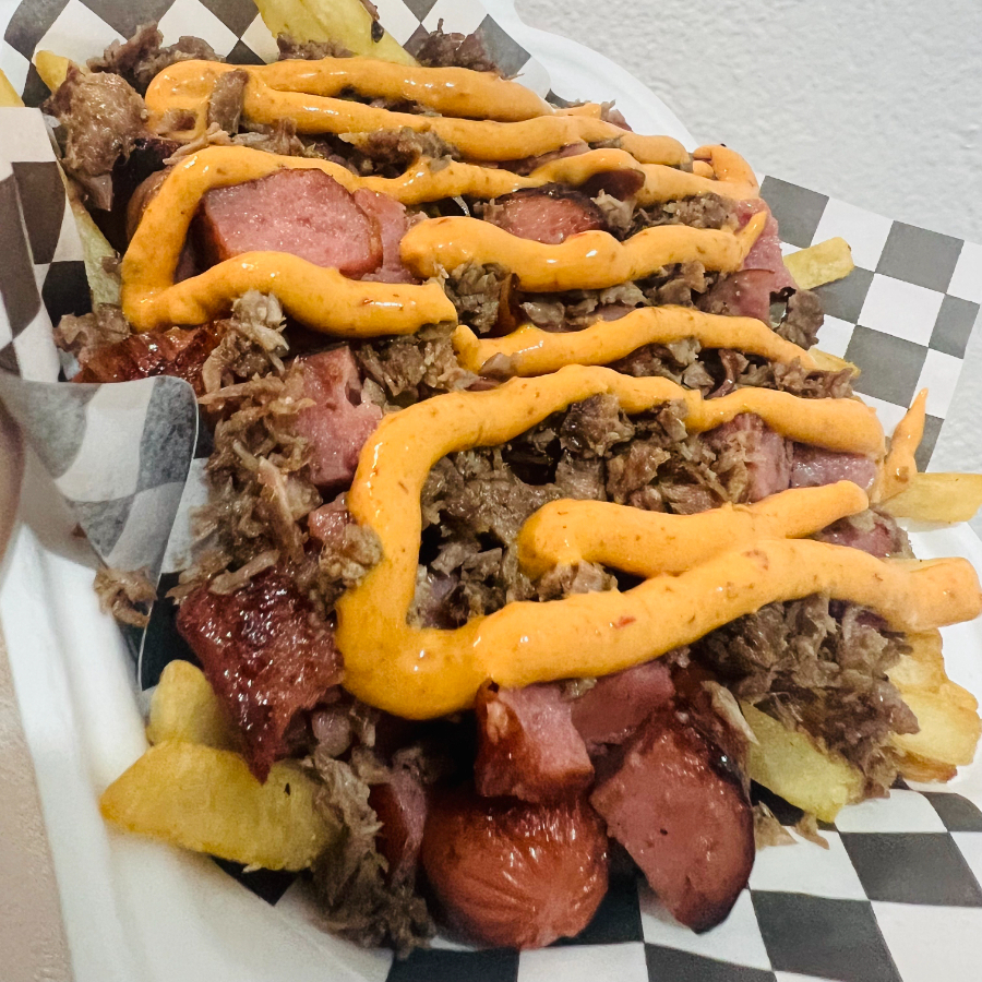 Salchicha de pollo con tocino jamón y queso amarillo, catsup, mayonesa,mostaza,cebolla y tomate.