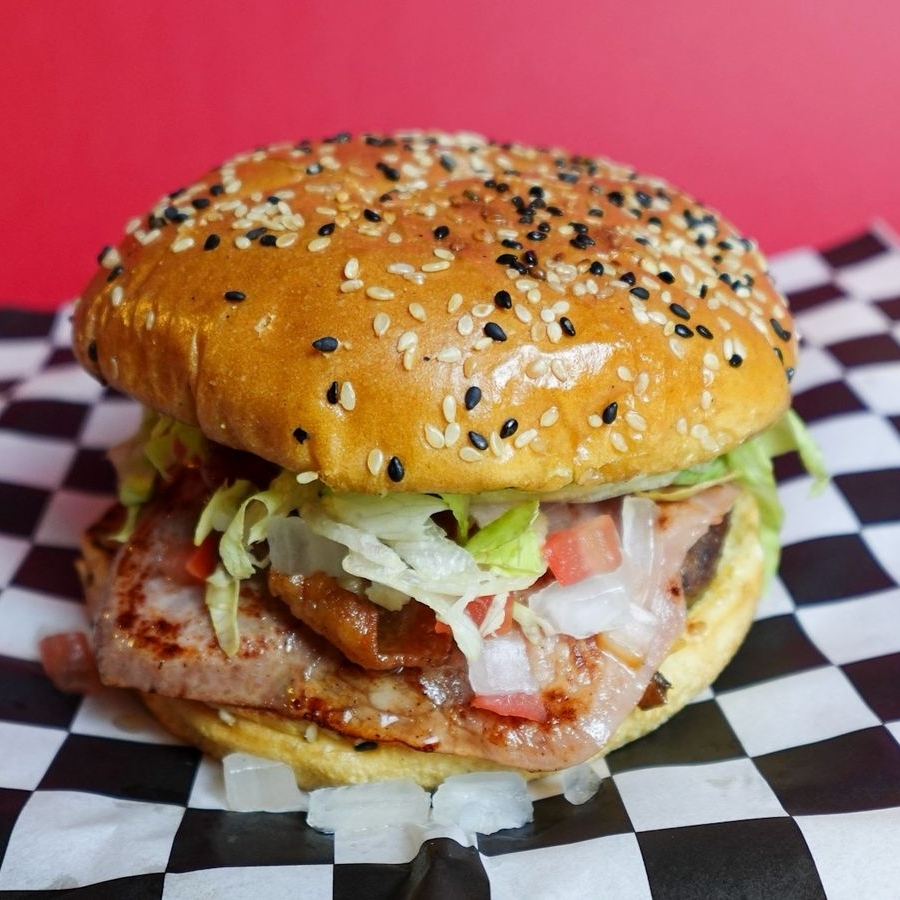 carne de res, jamon, queso, tocino, mayonesa, mostaza, tomate, cebolla.