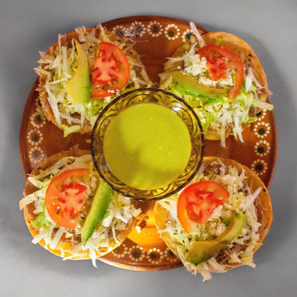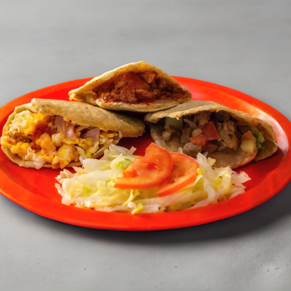 4 Piezas de tortilla hecha a mano, rellenas de desebrada, pollo, queso o filete de res o pollo.