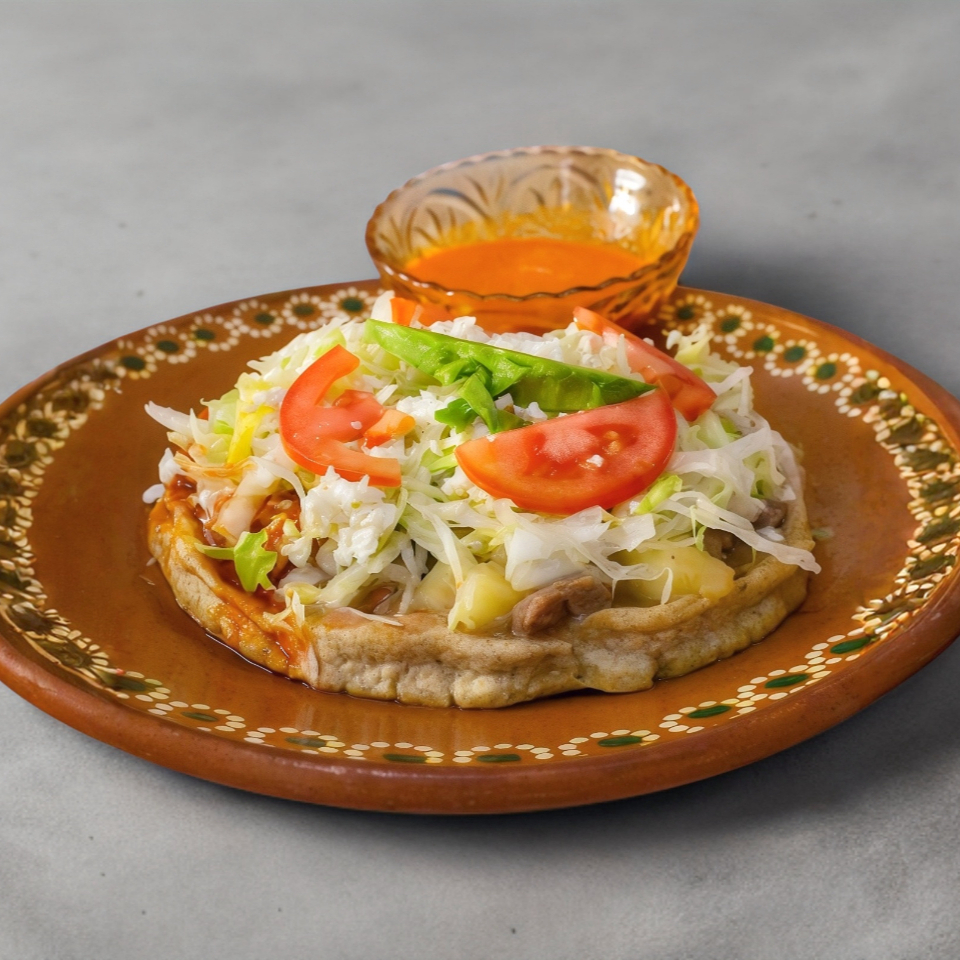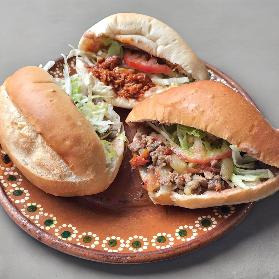 Elaborado con bolillo suave y dorado a la plancha, guisos a escoger: Bisteck con cilantro, cebolla, queso, aguacate o desebrada, bisteck ranchero o chicharron prensado, acompañada de lechuga, salsa, tomate, cebolla, aguacate y salsa de la casa.