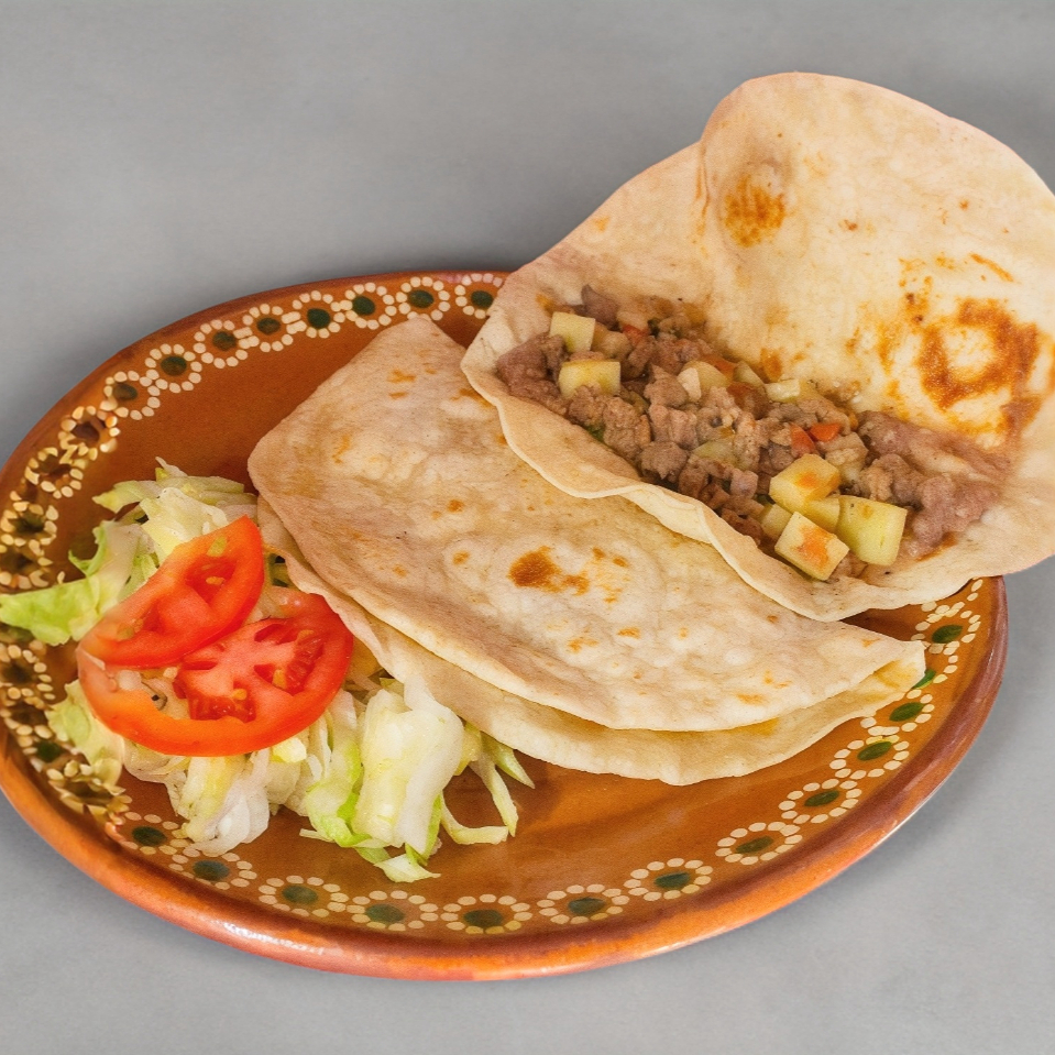 Tortilla de harina de 25 cm aprox, los puedes pedir de bisteck ranchero, Asado de puerco, chicharrón prensado, desebrada, picadillo, huevo al gusto.