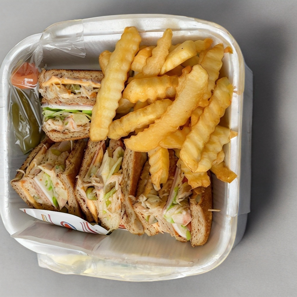 Club sandwich de jamon, ensalada de pollo acompañado de papas a la francesa y chile en vinagre