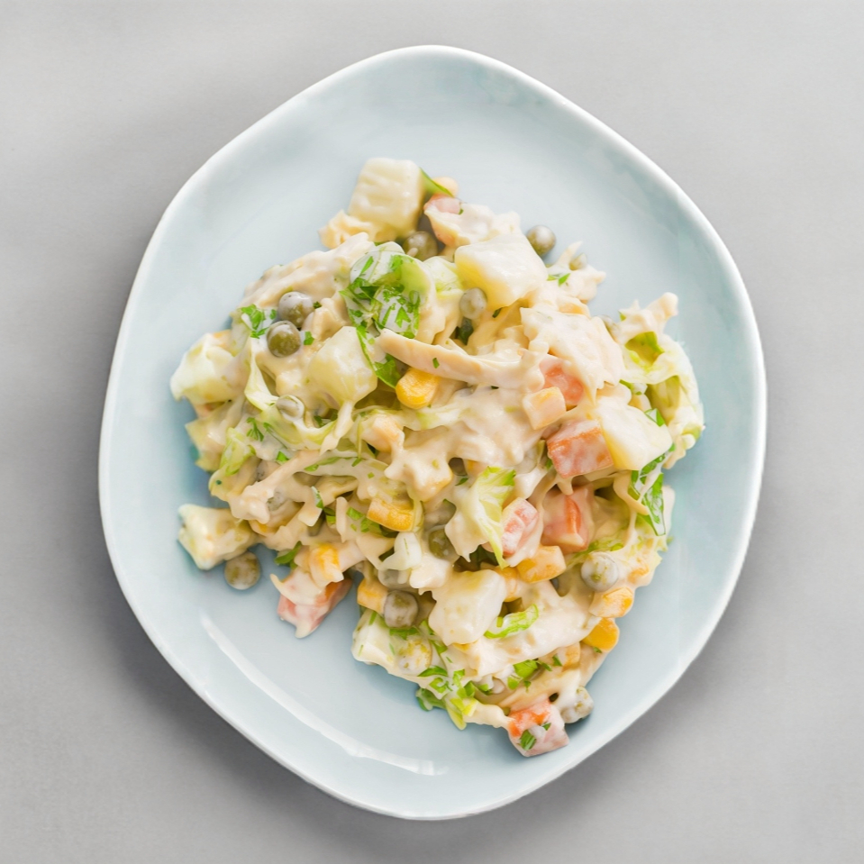 Pollo fresco, verduras, mayonesa, servida en una cama de lechuga, acompañada con chiles en vinagre y galletas.
