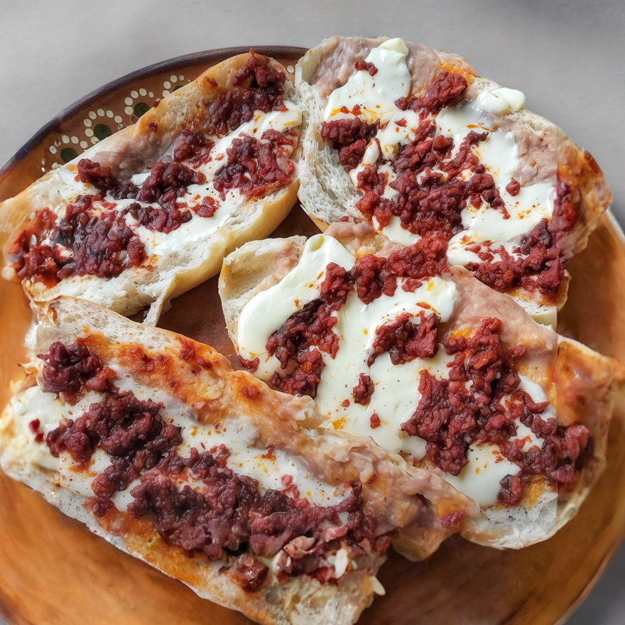 Con jamón y queso asadero, lo puedes pedir bañado en salsa de tomate, acompañados de frijoles, chilaquiles, tortillas y salsa de la casa.