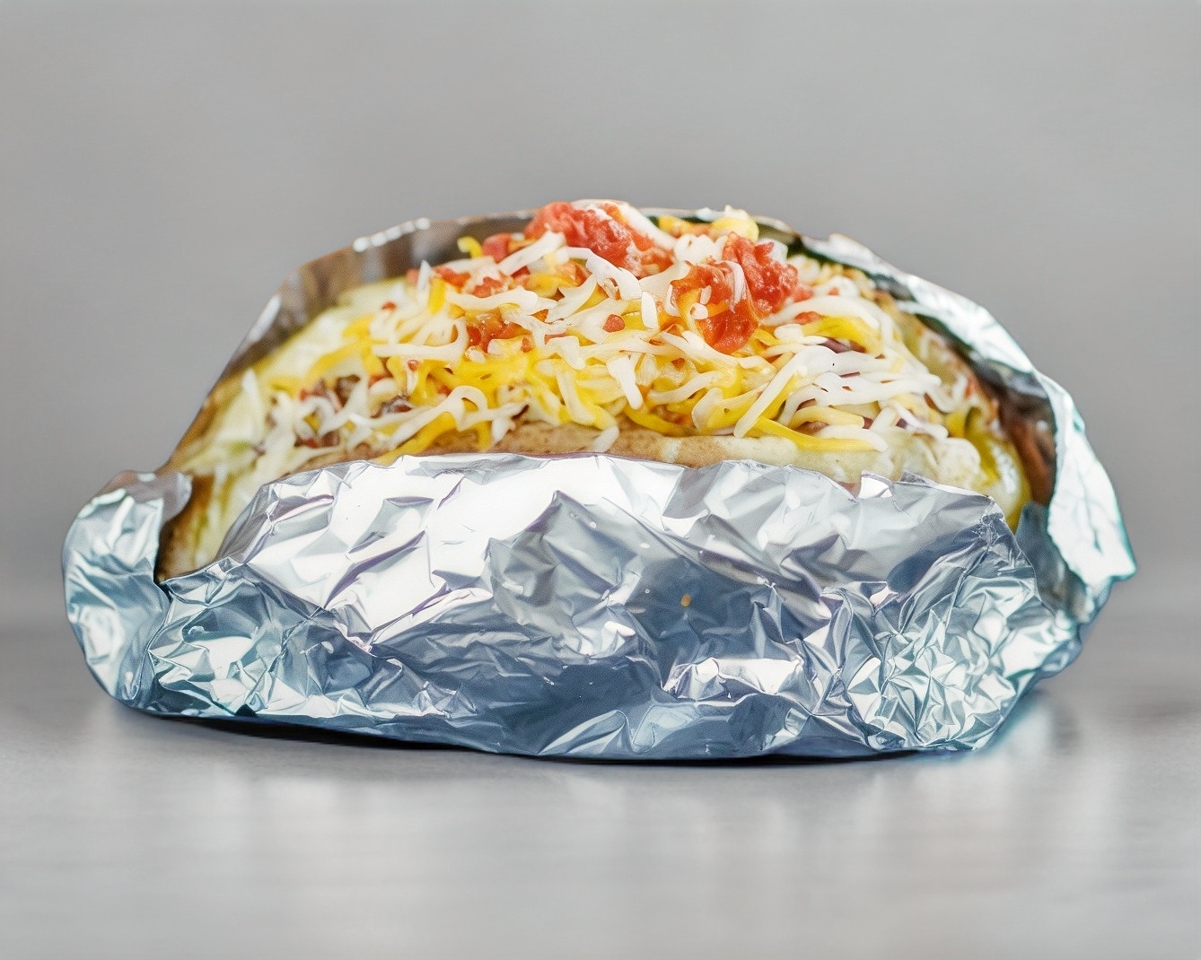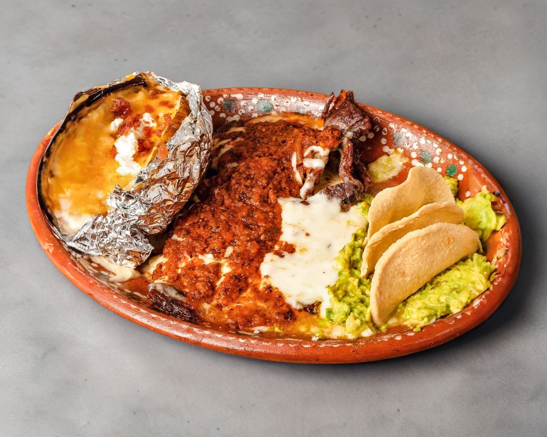 2 tacos grandes de tortillas de harina con fajita, queso fundido, chile morrón, tocino y cebolla asada
