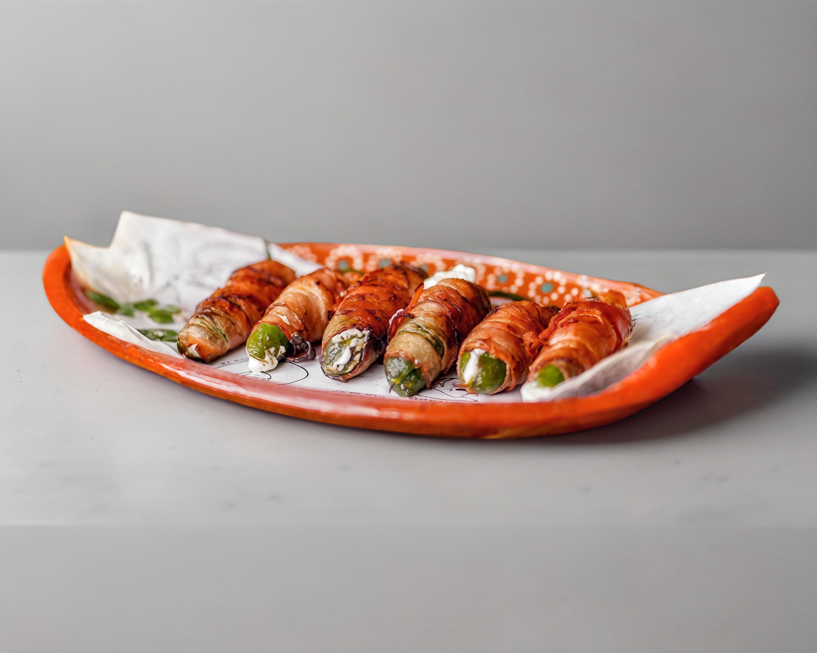 Orden de chiles asados rellenos de queso crema y envueltos en tocino