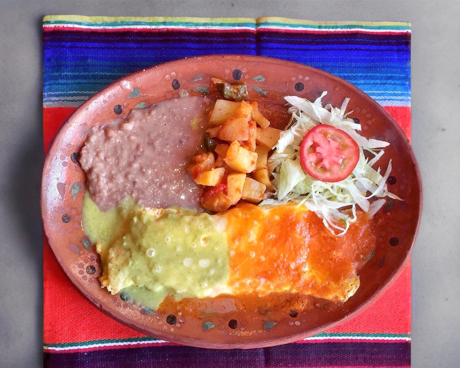 En salsa verde o roja, con queso, cebolla morada, deshebrada, crema y dos huevos estrellados, acompañados de frijoles y ensalada.