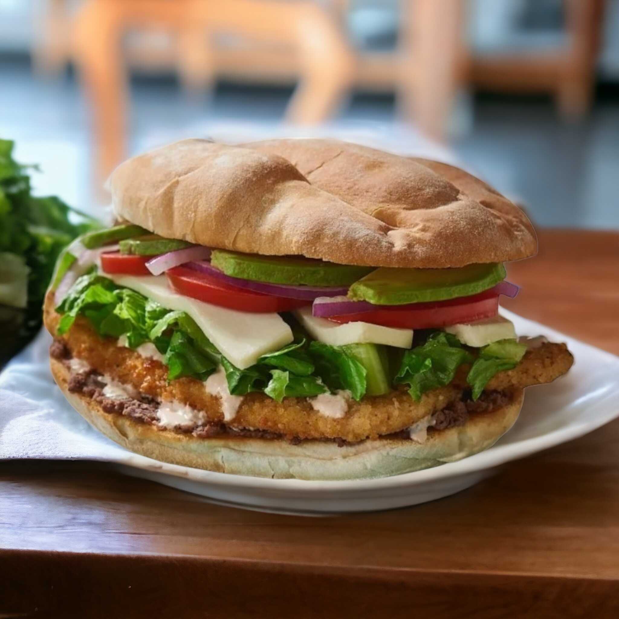 Torta de milanesa de pechuga de pollo empanizada, acompañada con frijoles bayos refritos, queso Oaxaca, lechuga, tomate, cebolla y aguacate, incluye chiles jalapeños.