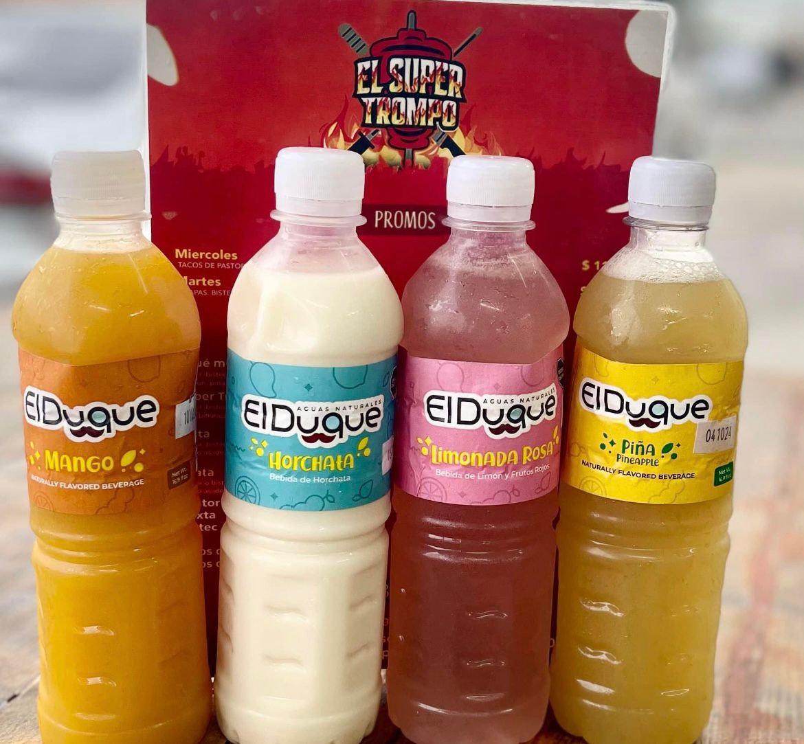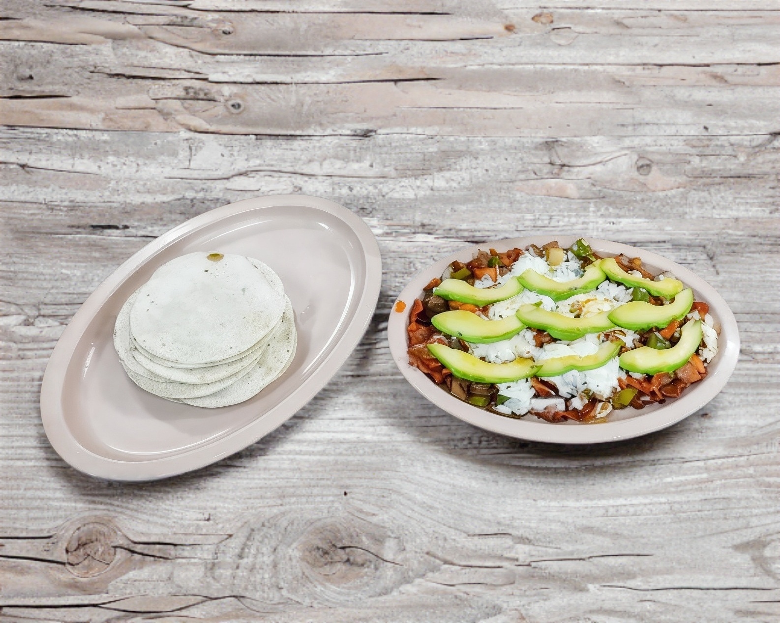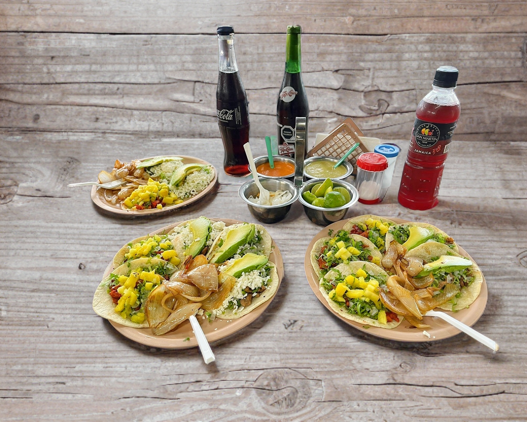 Bistec, pastor, queso asadero, queso canasto, cilantro, cebolla, aguacate.