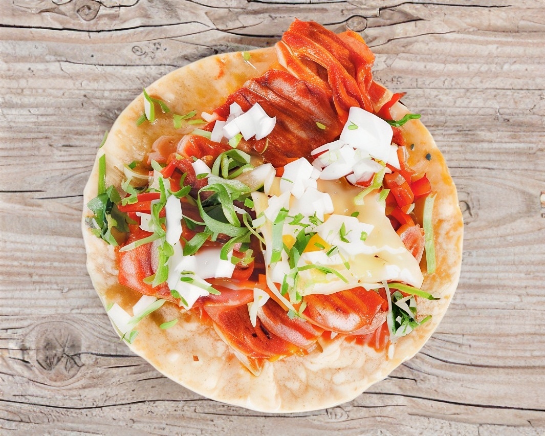 Bistec, tocino, jamón, morrón, cebolla y queso asadero.
