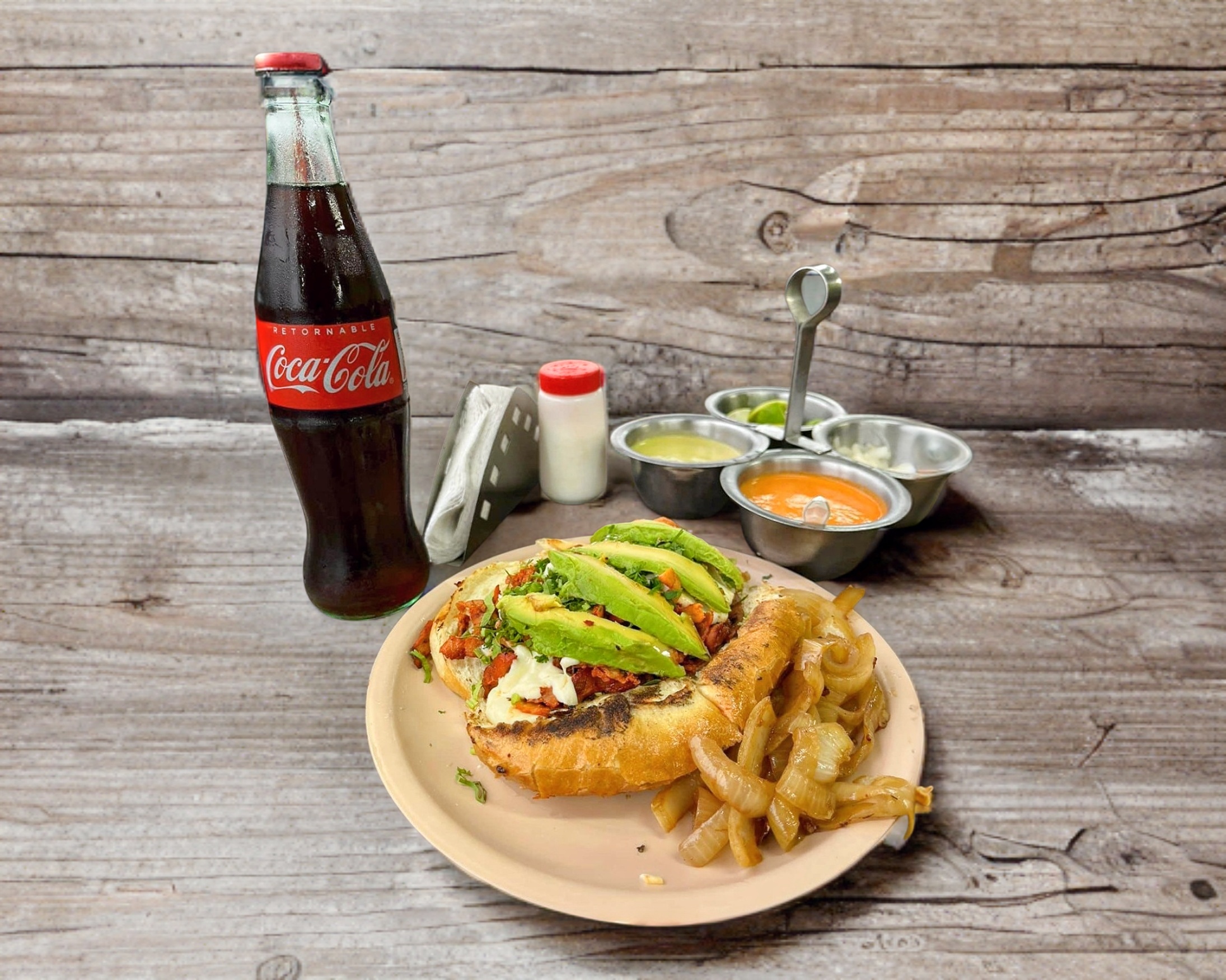Pastor, queso asadero, cilantro, cebolla, aguacate.
