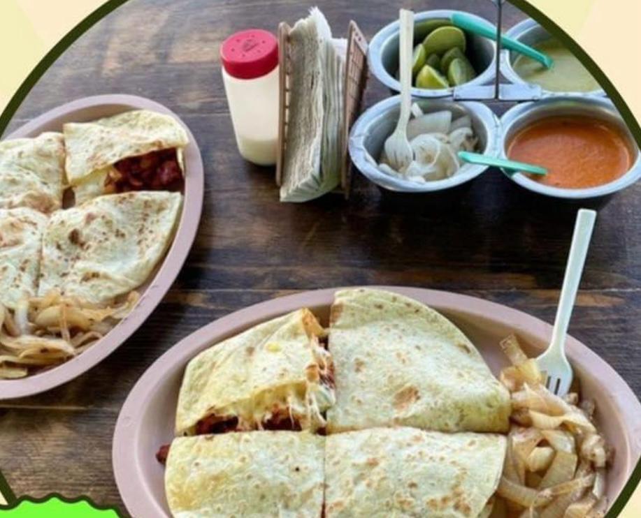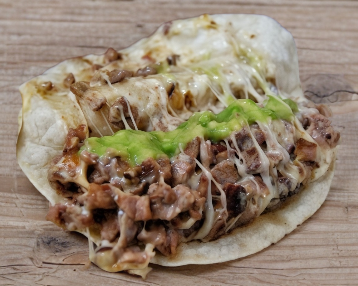 Tortilla de harina, bistec, queso asadero, queso canasto, cilantro, cebolla y aguacate. Salsas y limones por separado. Por unidad