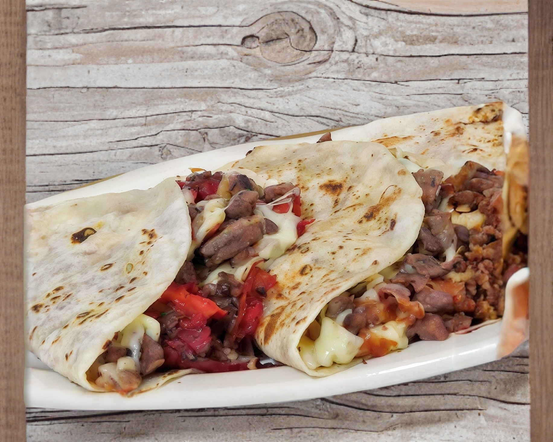 2 Tortillas de harina, pastor, piña y queso asadero.