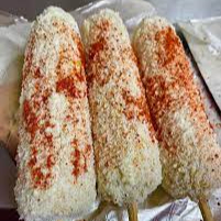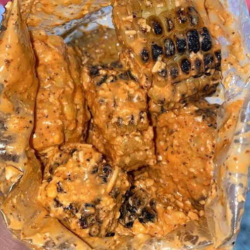 Elote entero asado, mantequilla, mayonesa, chile y queso, limon y sal