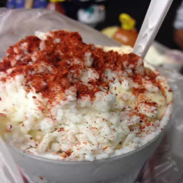 Elote desgranado en vaso, con mayonesa, mantequilla, queso y chile