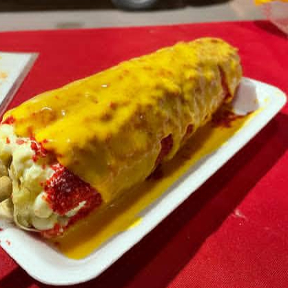 Elote con cubierta de chetos flami hot, bañado en queso amarillo