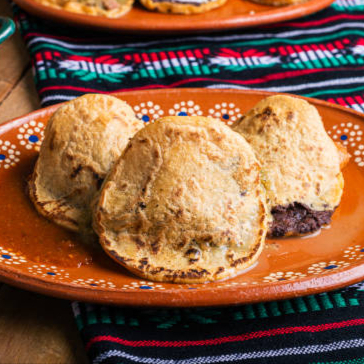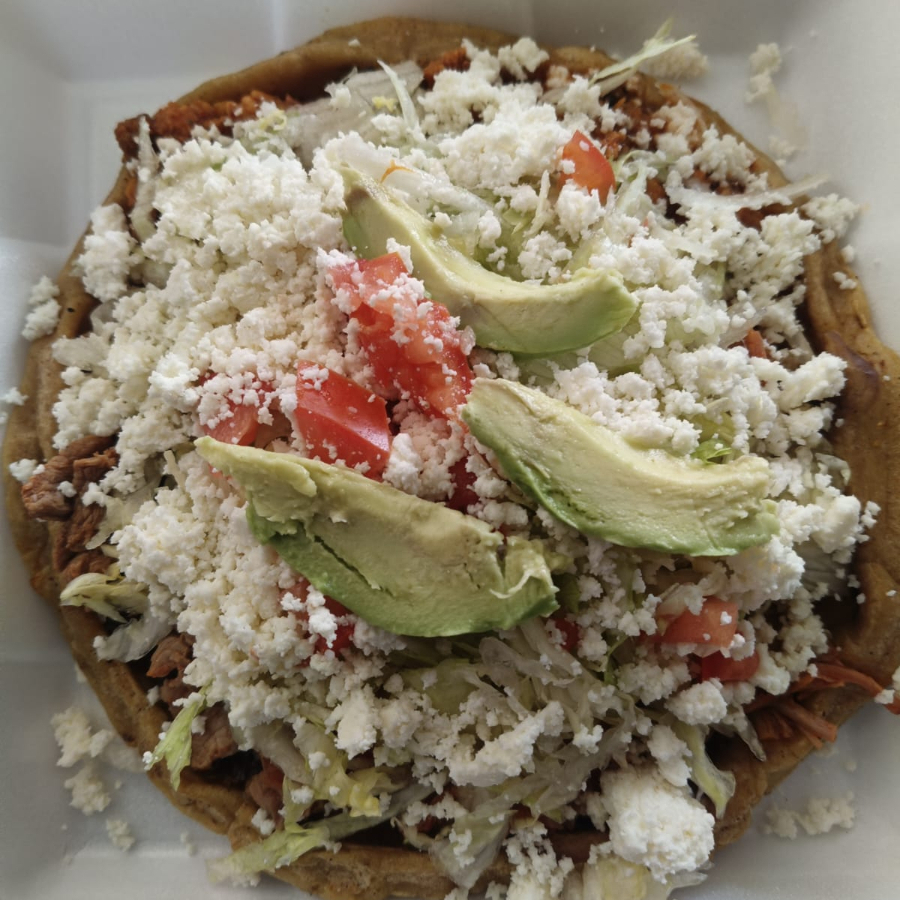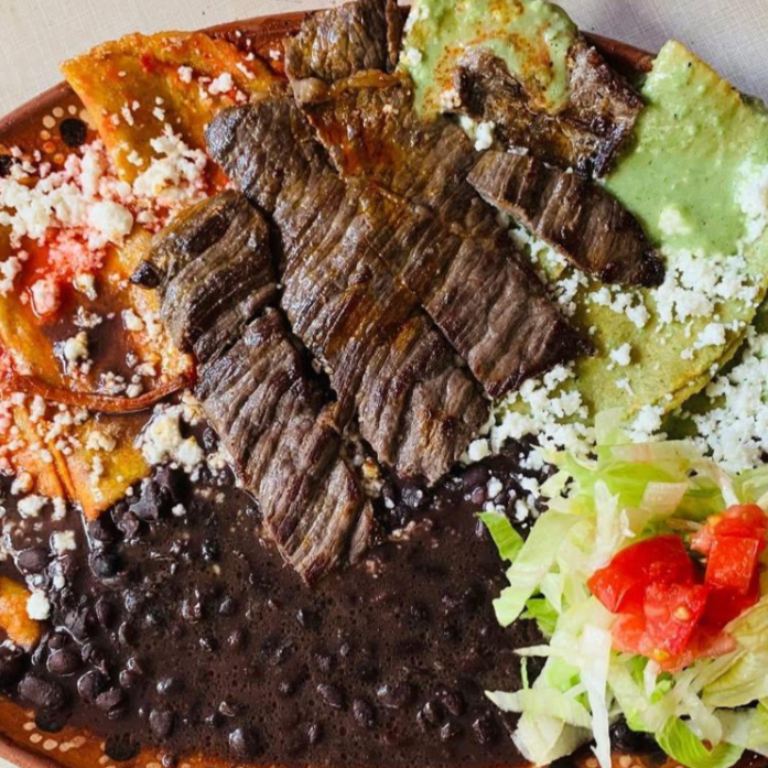 6 tortillas recien echas de maiz tamaño medio bañadas en salsa a su gusto, queso fresco, porcion de frijoles negros guisados con manteca de puerco, cebolla, porcion de cecina de res y porcion de ensalada de lechuga.