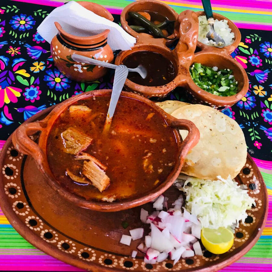 un litro de rico y delicioso pozole con sus respectivas tostadas, cebolla y li,om