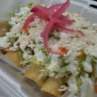 5 deliciosas flautas de desebrada acompañada con sus complementos tales como lechuga,queso,crema y tomate.