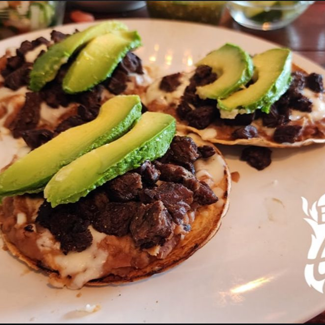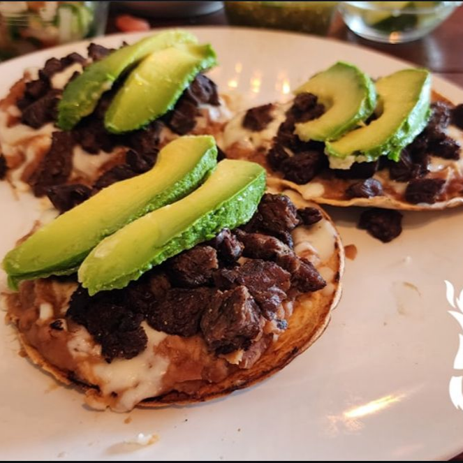 Tostadas con frijoles de la casa, queso gratinado, fajita de res de 150 gramos y guacamole al centro.
