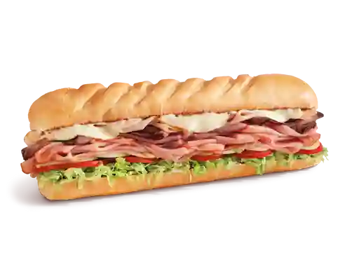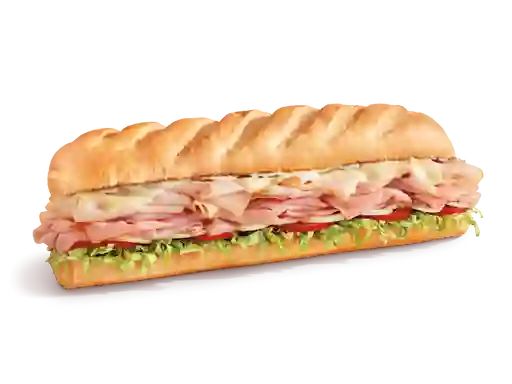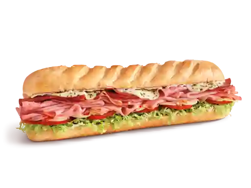 Sándwich de 30 cm con pavo ahumado, jamón virginia honey, tocino crujiente, queso monterrey jack, mayonesa, mostaza deli style, lechuga, tomate y cebolla, tamaño a elegir.