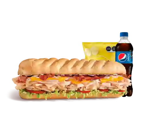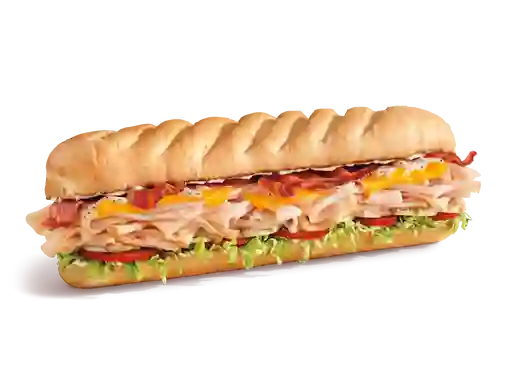 Sándwich de 30 cm con pavo ahumado, tocino crujiente, queso cheddar, mayonesa, lechuga, tomate, cebolla y aderezo ranch, tamaño a elegir.