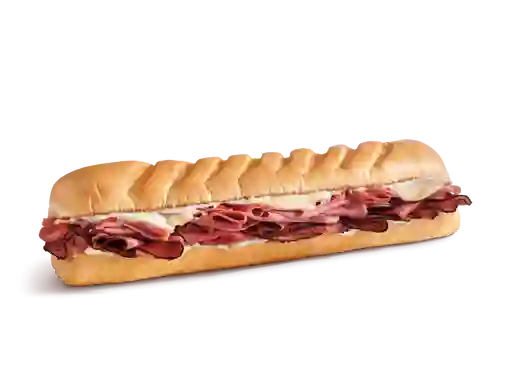 Sándwich de 30 cm con pastrami, queso provolone, mayonesa, mostaza deli style y aderezo italiano de la casa, tamaño a elegir.
