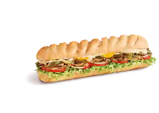 Sándwich de 30 cm con pimientos, cebollas caramelizadas, champiñones, lechuga, tomate, cebolla, mayonesa, mostaza deli style, aderezo italiano de la casa, queso provolone, cheddar y monterey jack, tamaño a elegir.