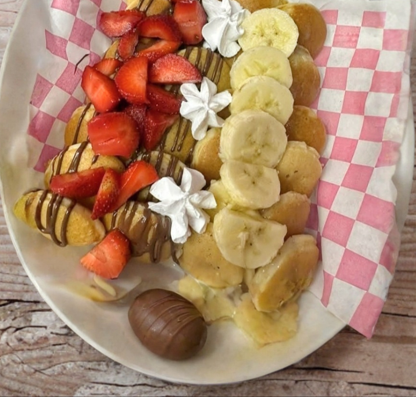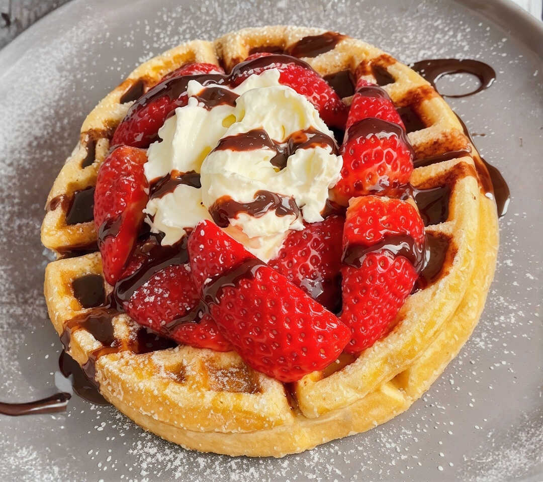 wuafle ,con platano,fresas ,miel,chocolate,topping
