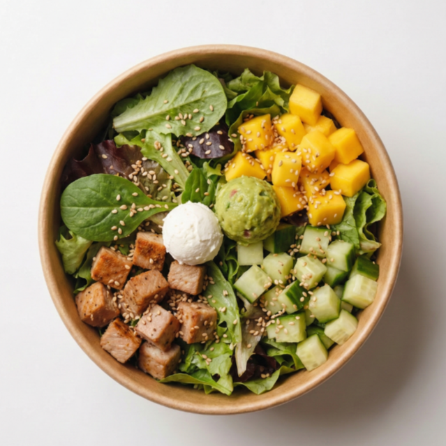 "MEDALLON DE ATÚN" mango, mix de lechuga, pepino, queso crema, guacamole, ajonjolí miel, zanahoria rayada; vinagreta limón y miel