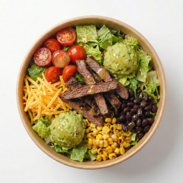 "NEW YORK STEAK" mix de lechugas, tomate cherry, queso manchego, elote amarillo, cebolla morada encurtida, frijol negro, guacamole; aderezo macha ranch