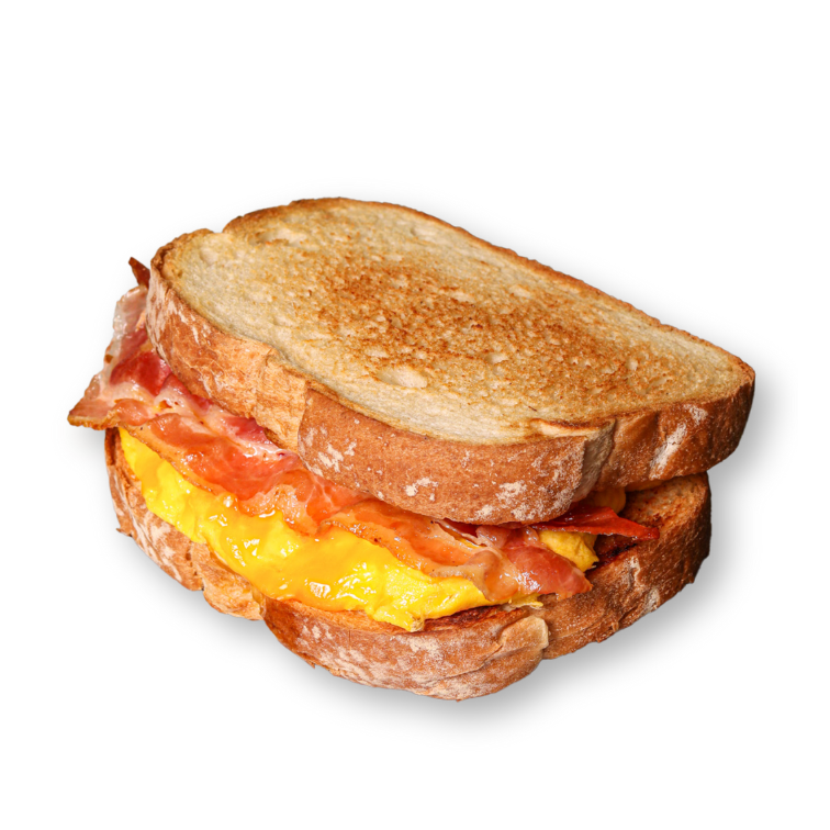 "PAN BRIOCHE - HUEVOS REVUELTOS" tocino, cebollín tostado, queso americano, acompañado de aderezo chipotle