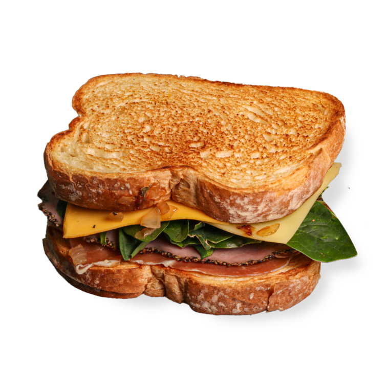 "PAN BLANCO ARTESANO - SERRANO, PASTRAMI, YORK" cebolla acaramelizada, mix de lechugas, queso manchego y americano; acompañado con jalapeños