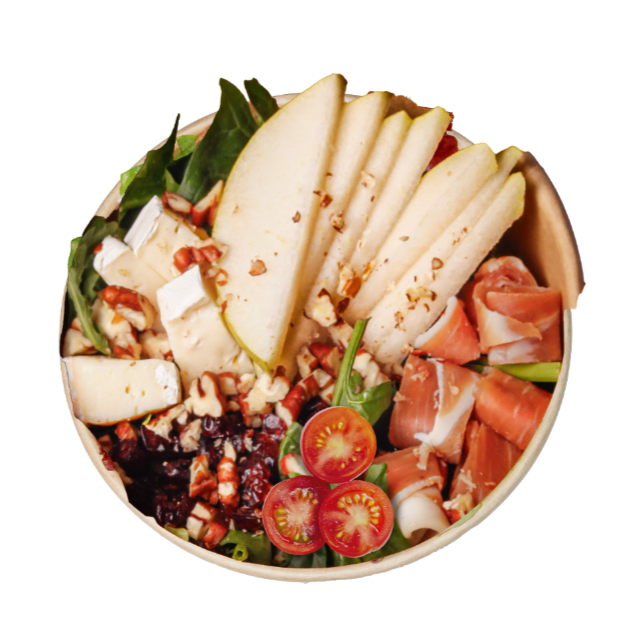 "JAMÓN SERRANO" pera, mix de lechugas, queso brie, arándanos, nuez, pistaches, tomate cherry, miel de abeja