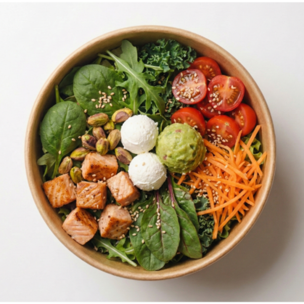 "SALMÓN" mix de lechugas, pistaches, queso crema, tomate cherry, zanahoria rayada, guacamole, ajonjolí miel; vinagreta de limón y miel
