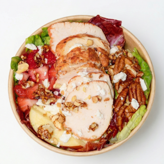 "PECHUGA DE POLLO" mix de lechugas, queso de cabra, fresa, manzana, palanqueta, nuez, ajonjolí miel; aderezo vinagreta de fresa