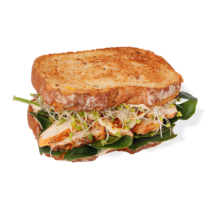 "PAN MULTIGRANO ARTESANO - PECHUGA DE POLLO" queso panela, germinado de temporada, mix de lechugas; acompañado con aderezo macha ranch