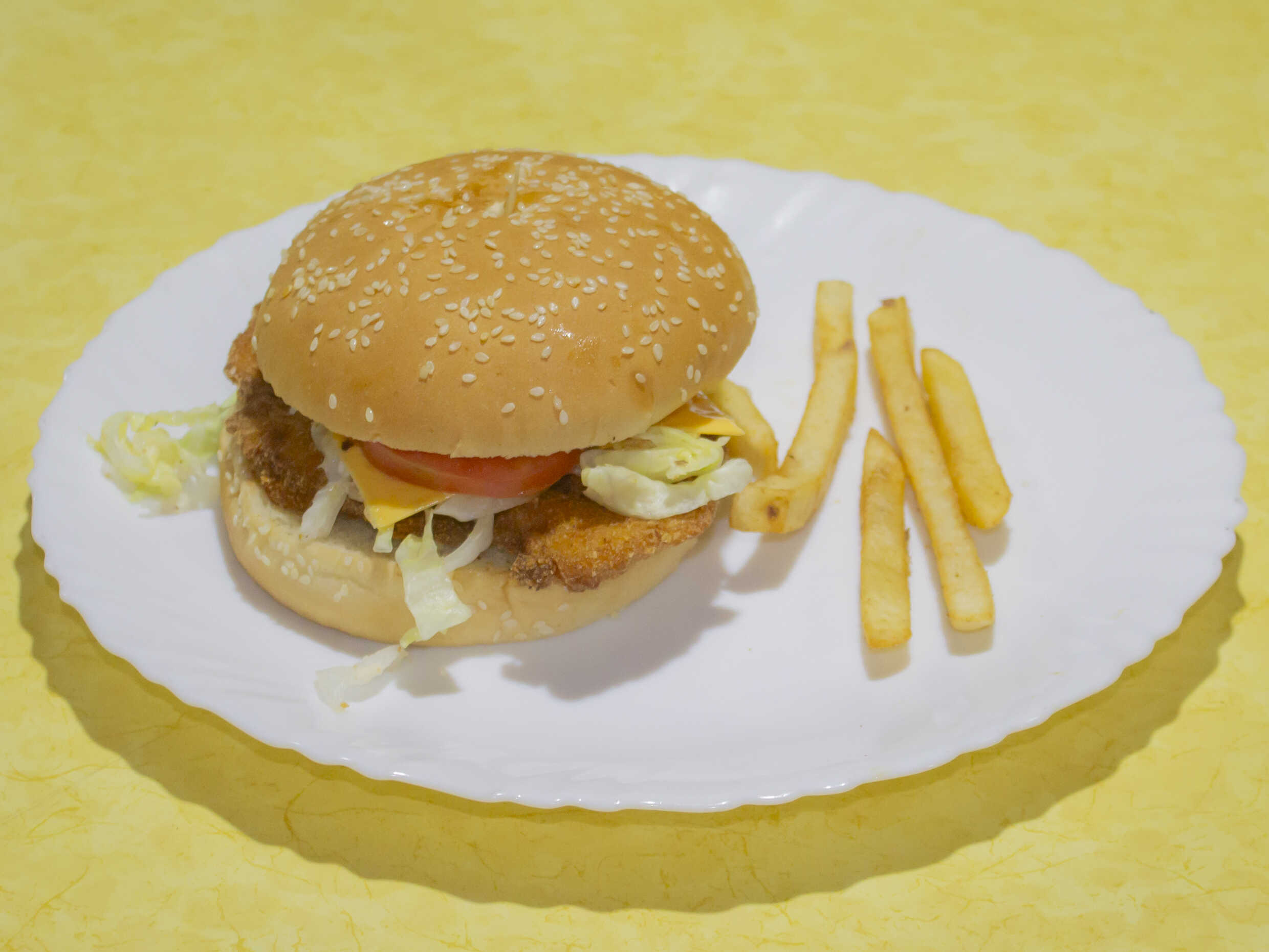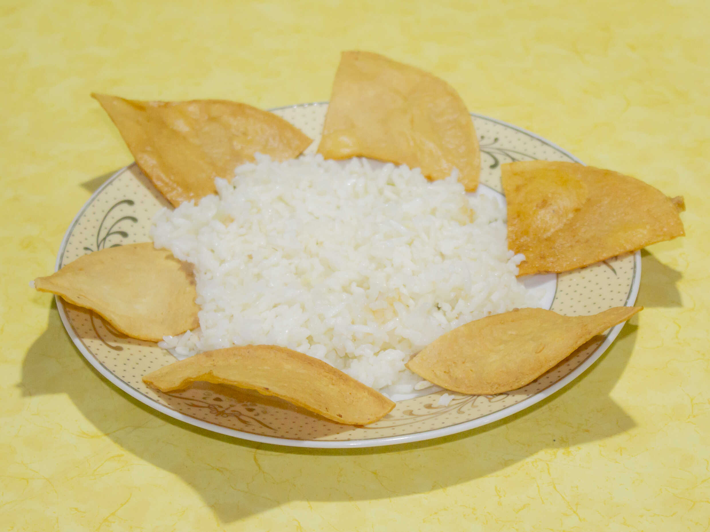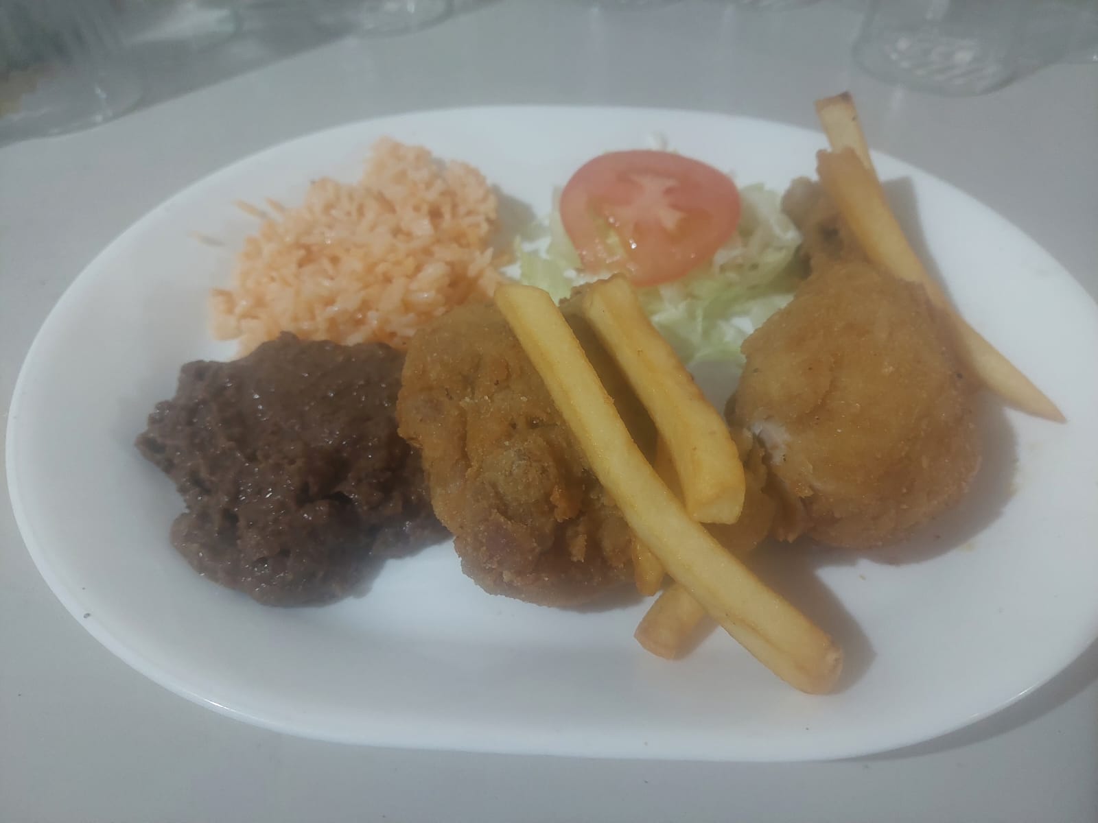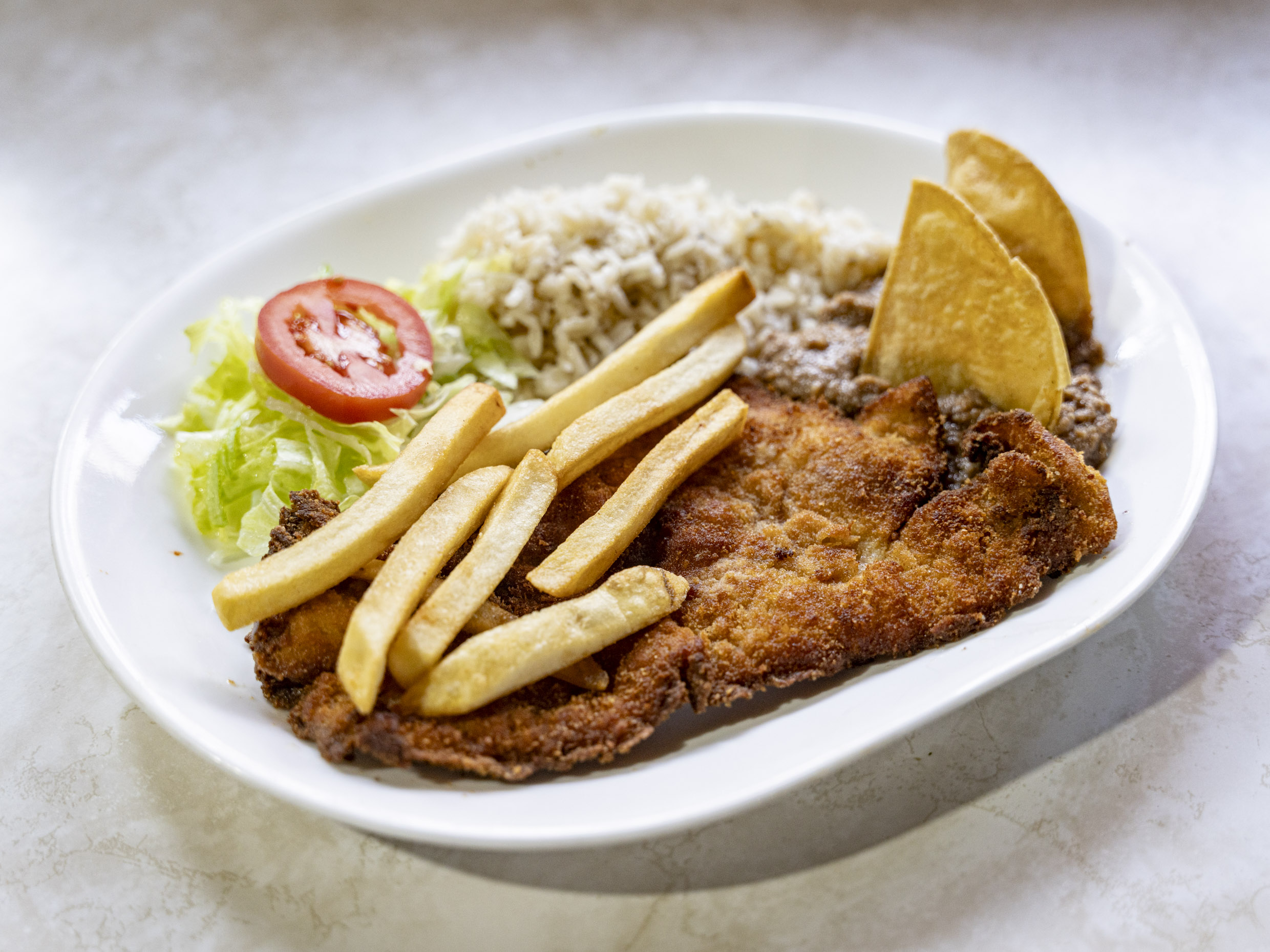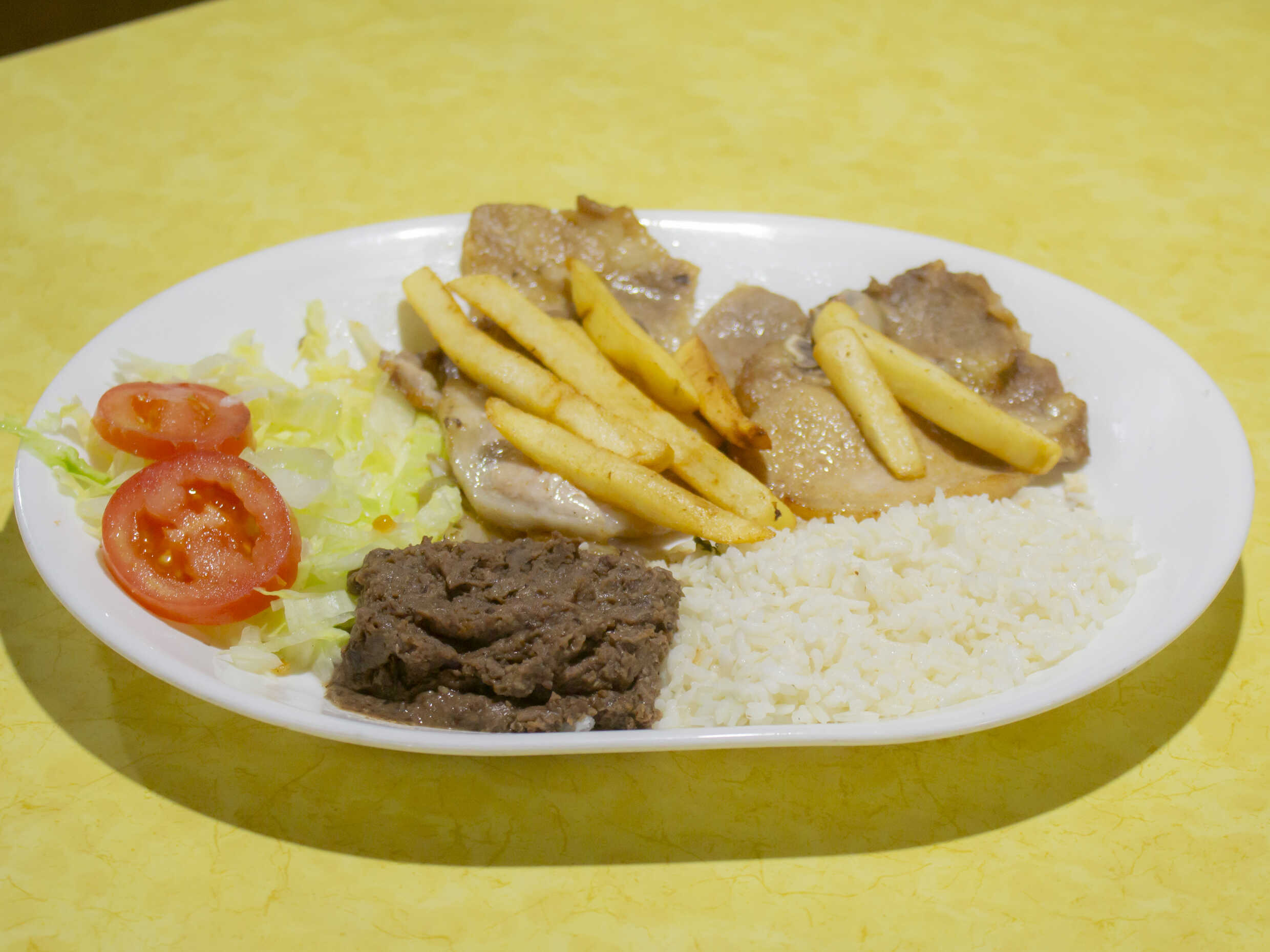 Acompañado de arroz, frijoles, verdura y papas fritas.