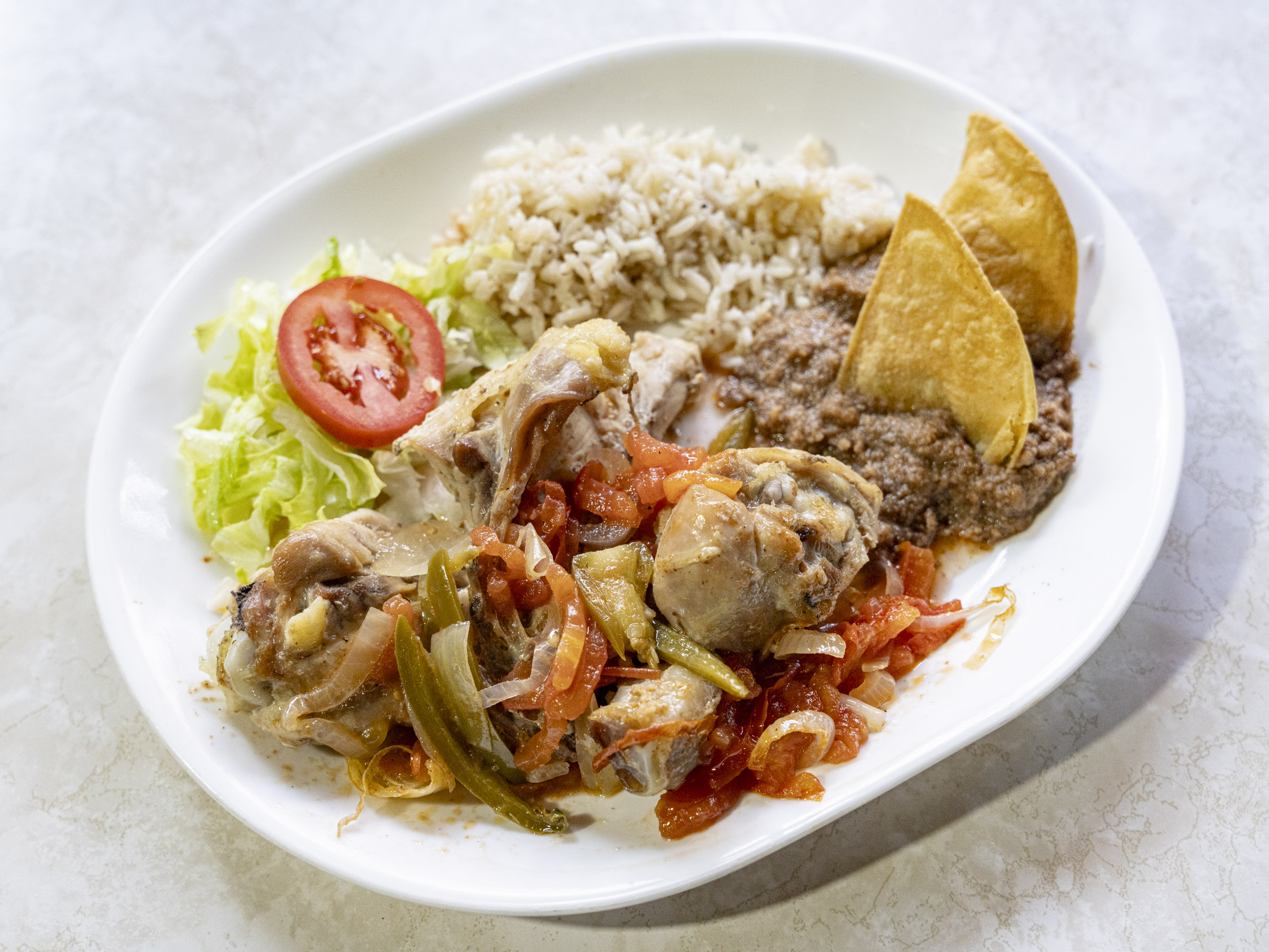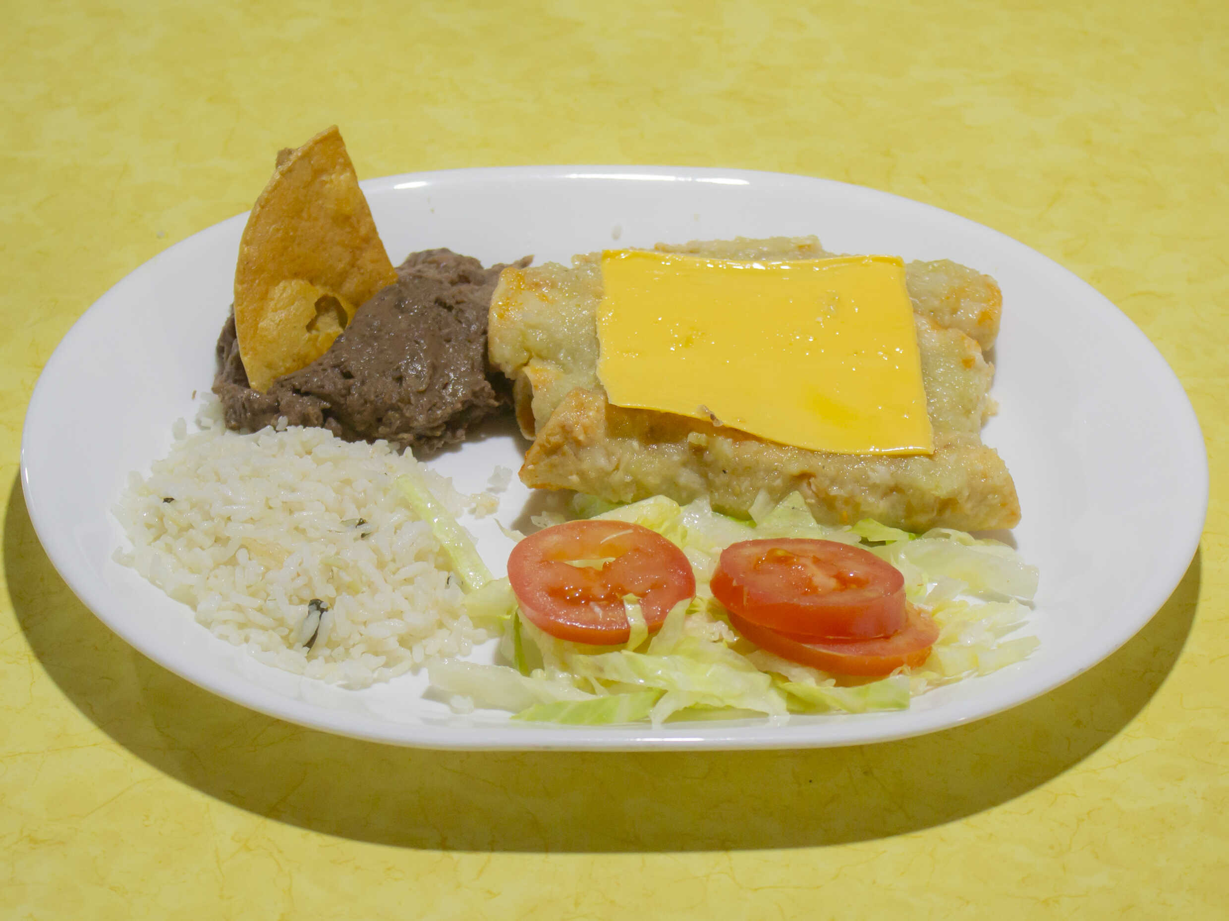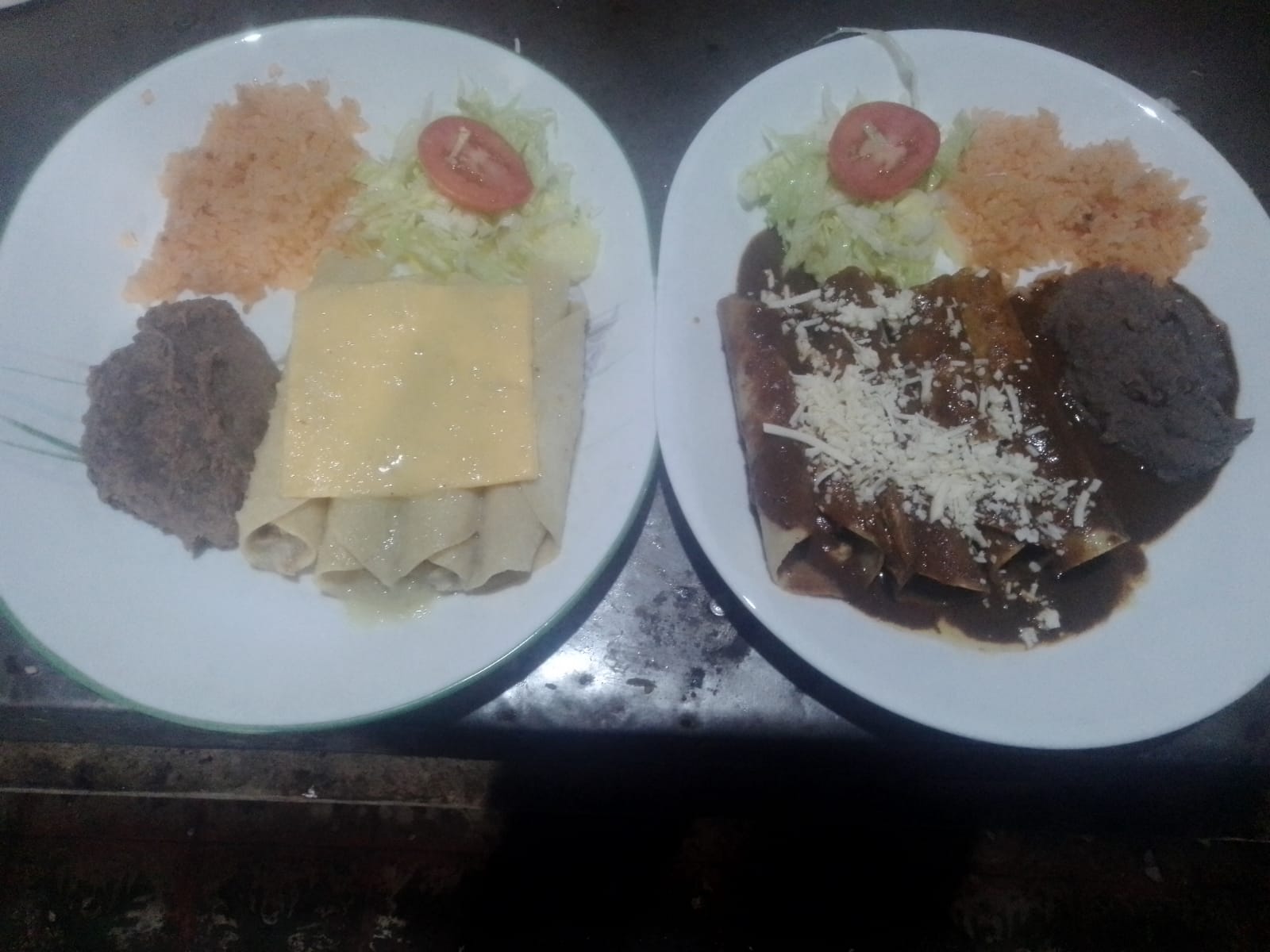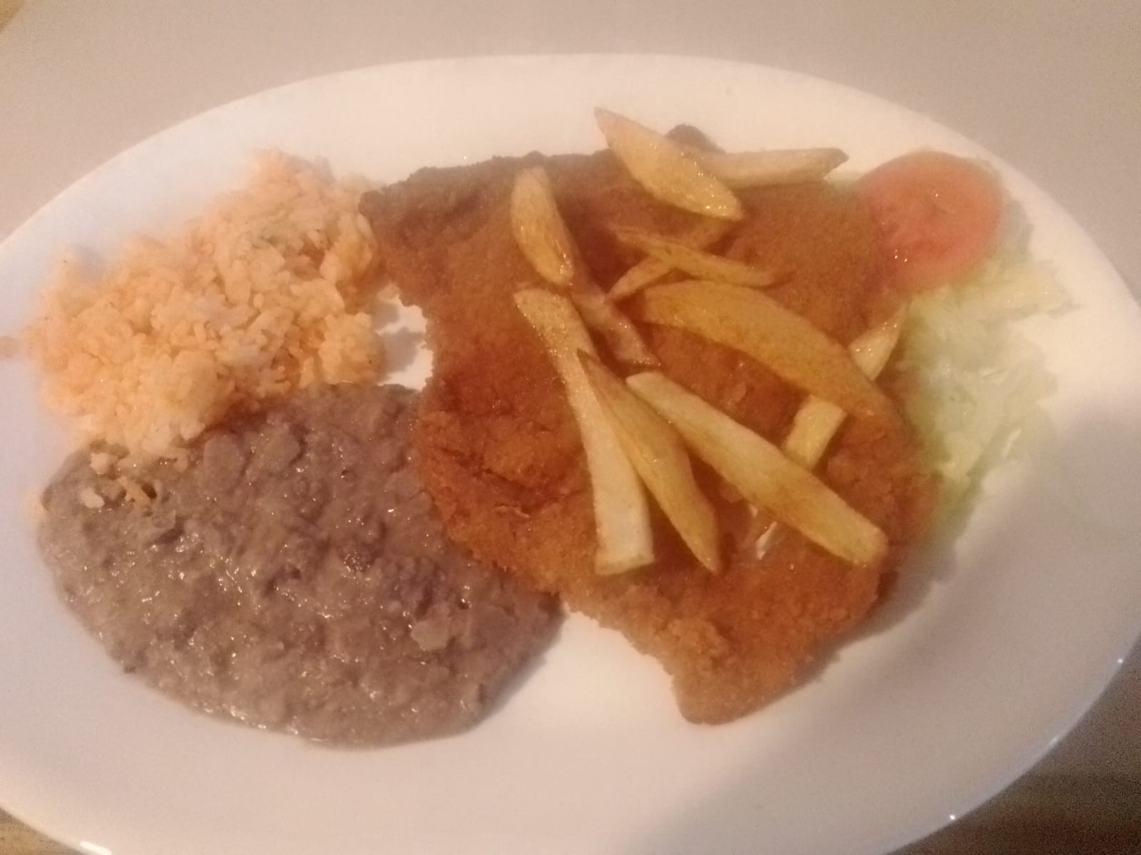 Acompañada con frijoles, arroz, verdura y papas fritas.