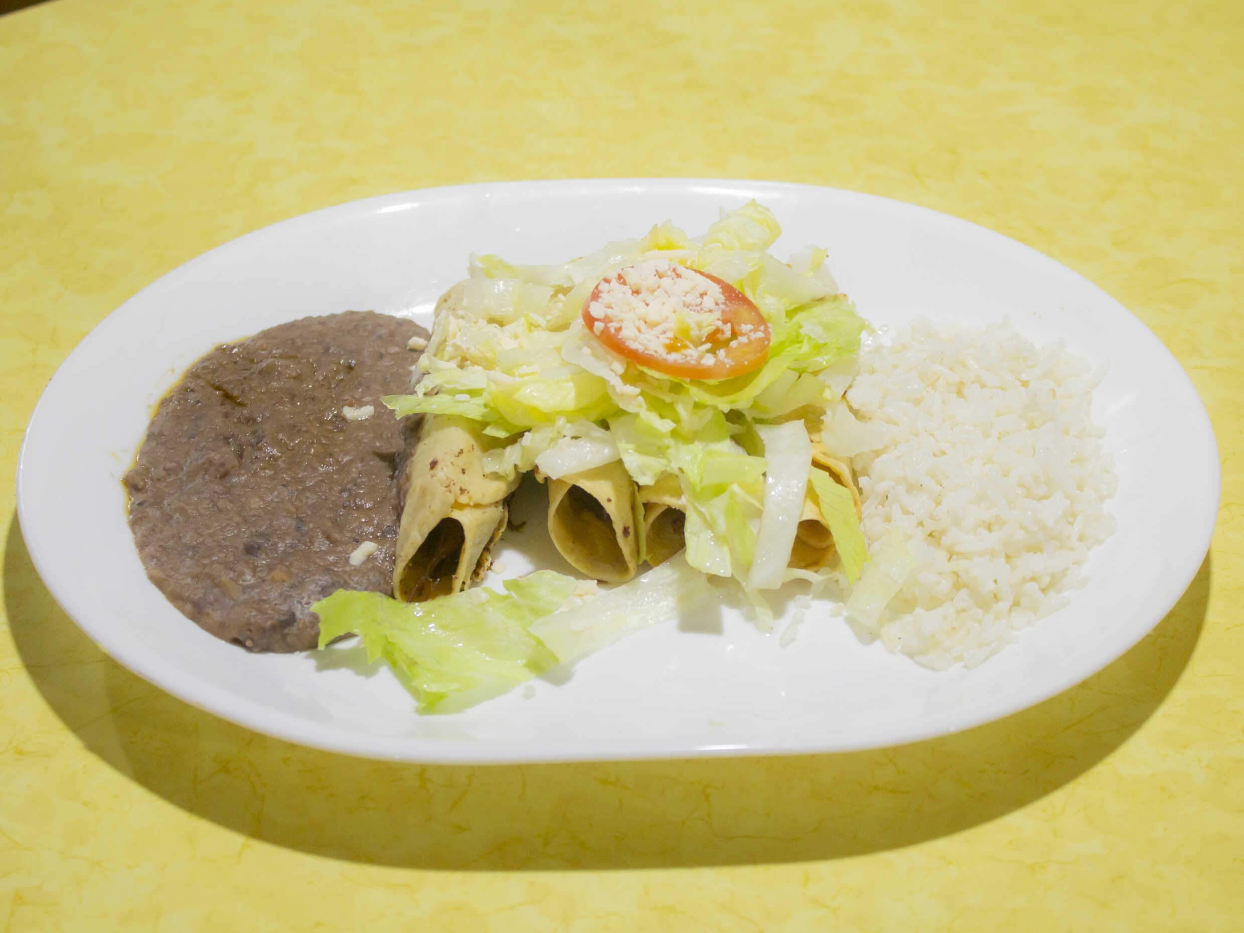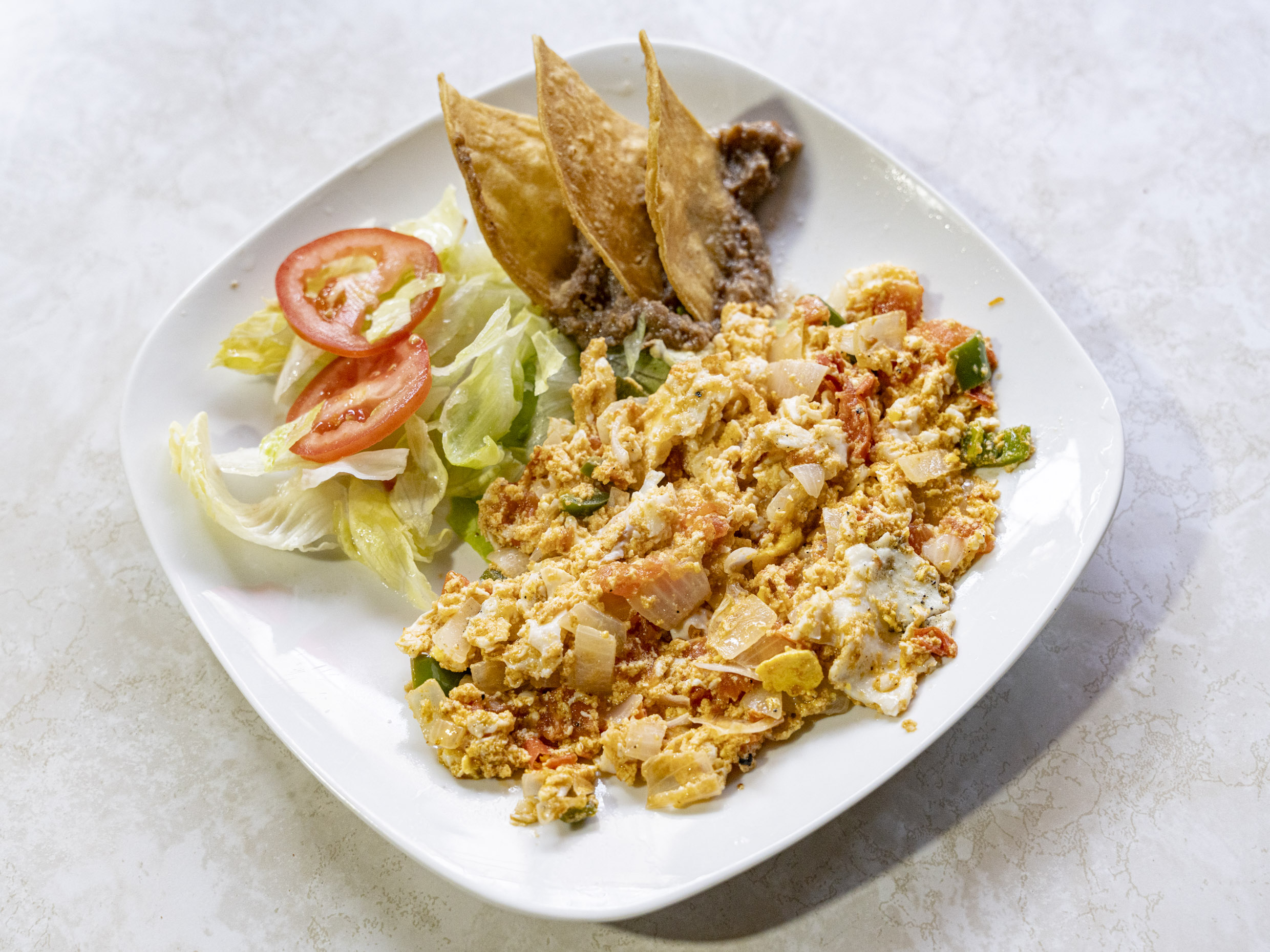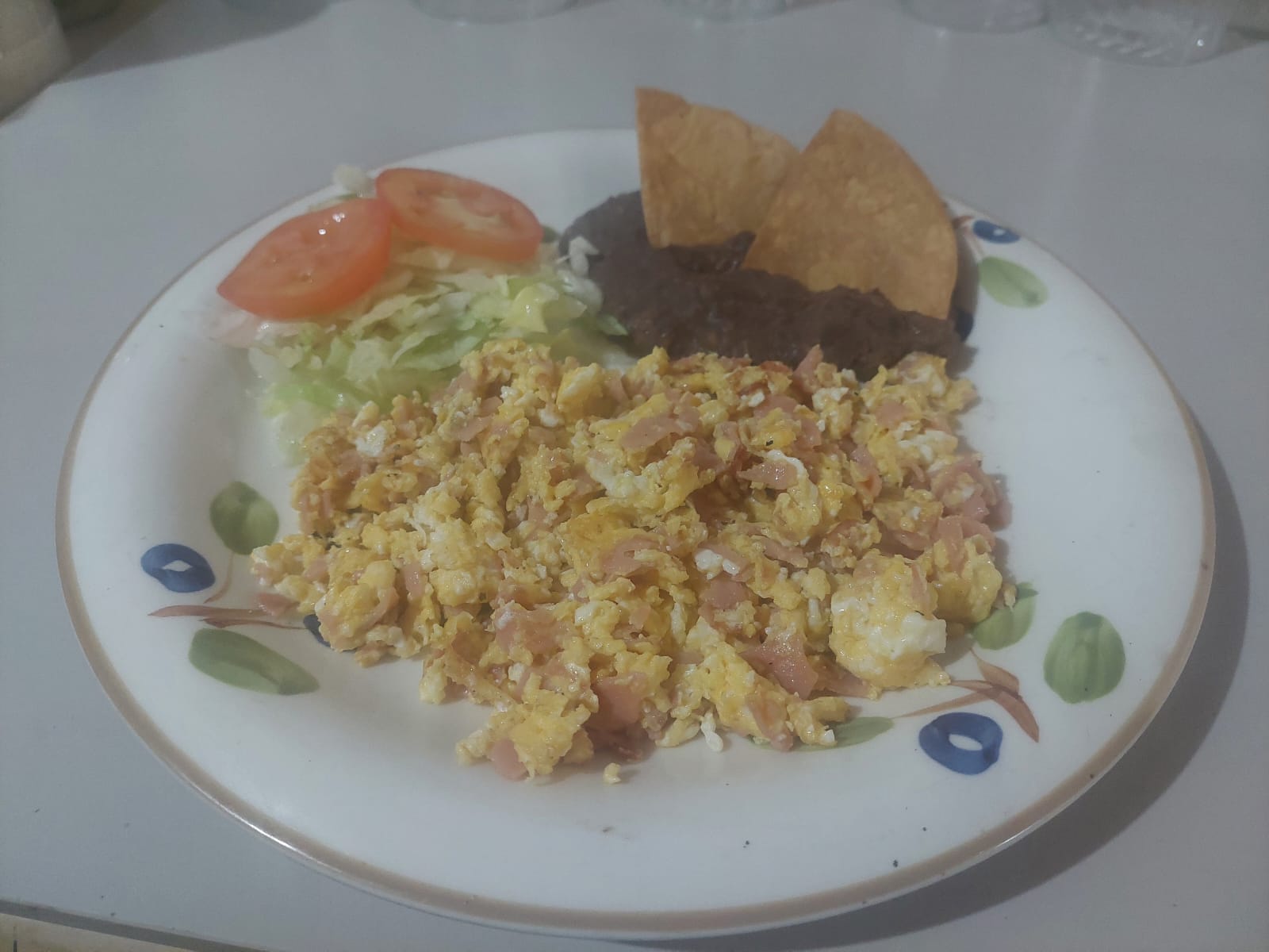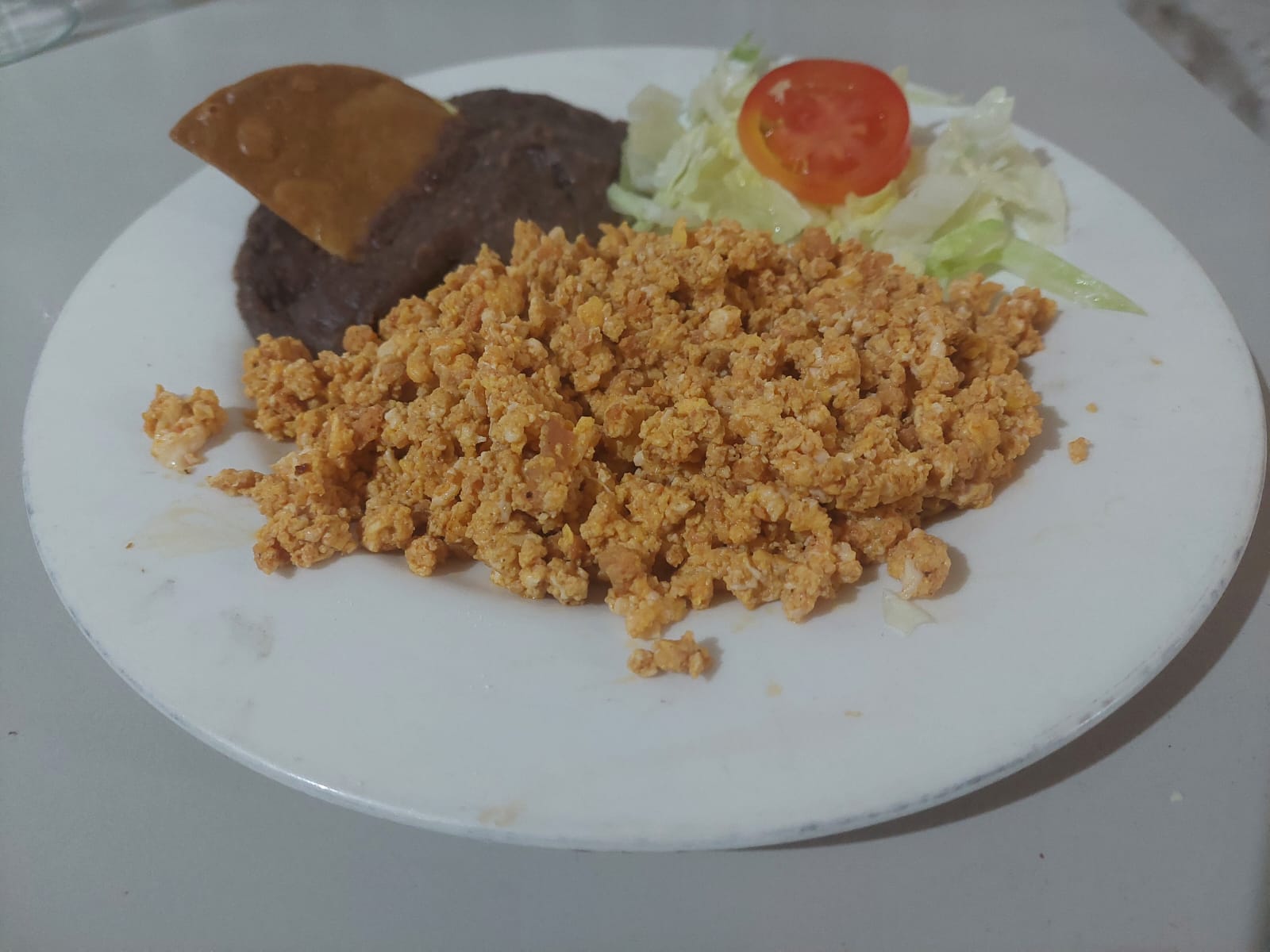 Acompañada con frijoles, arroz, verdura y papas fritas.